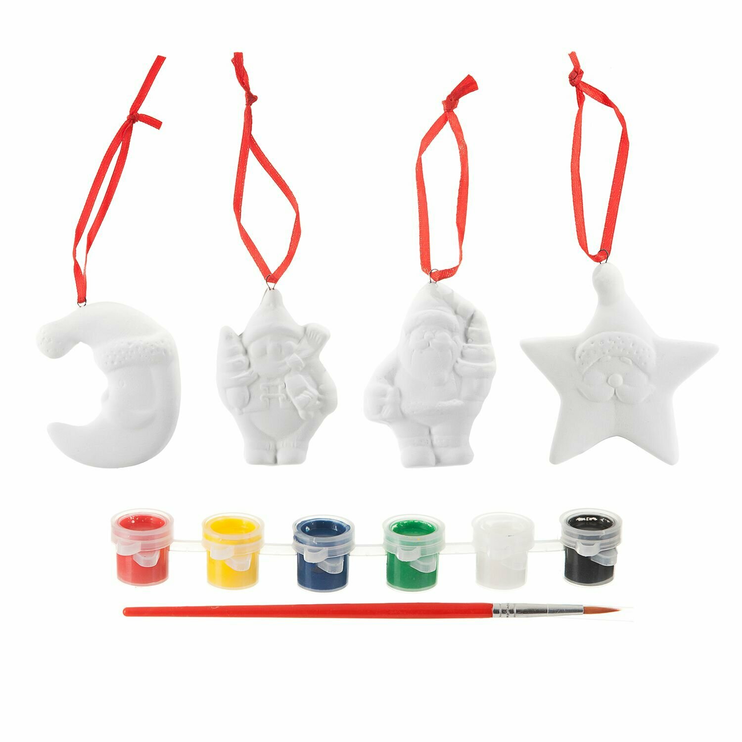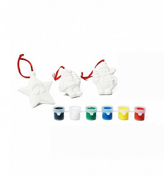 В комплекте есть всё необходимое для росписи керамических фигурок: 4 фигурки и 6 разноцветных красок с кисточкой.
