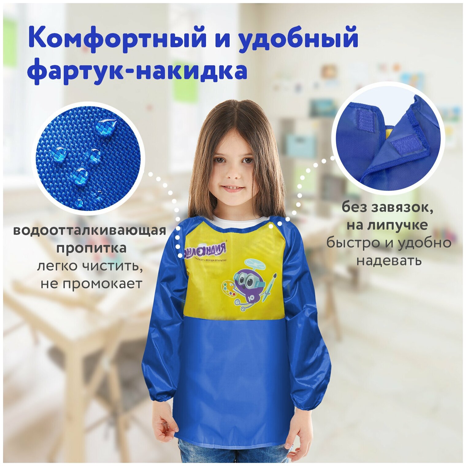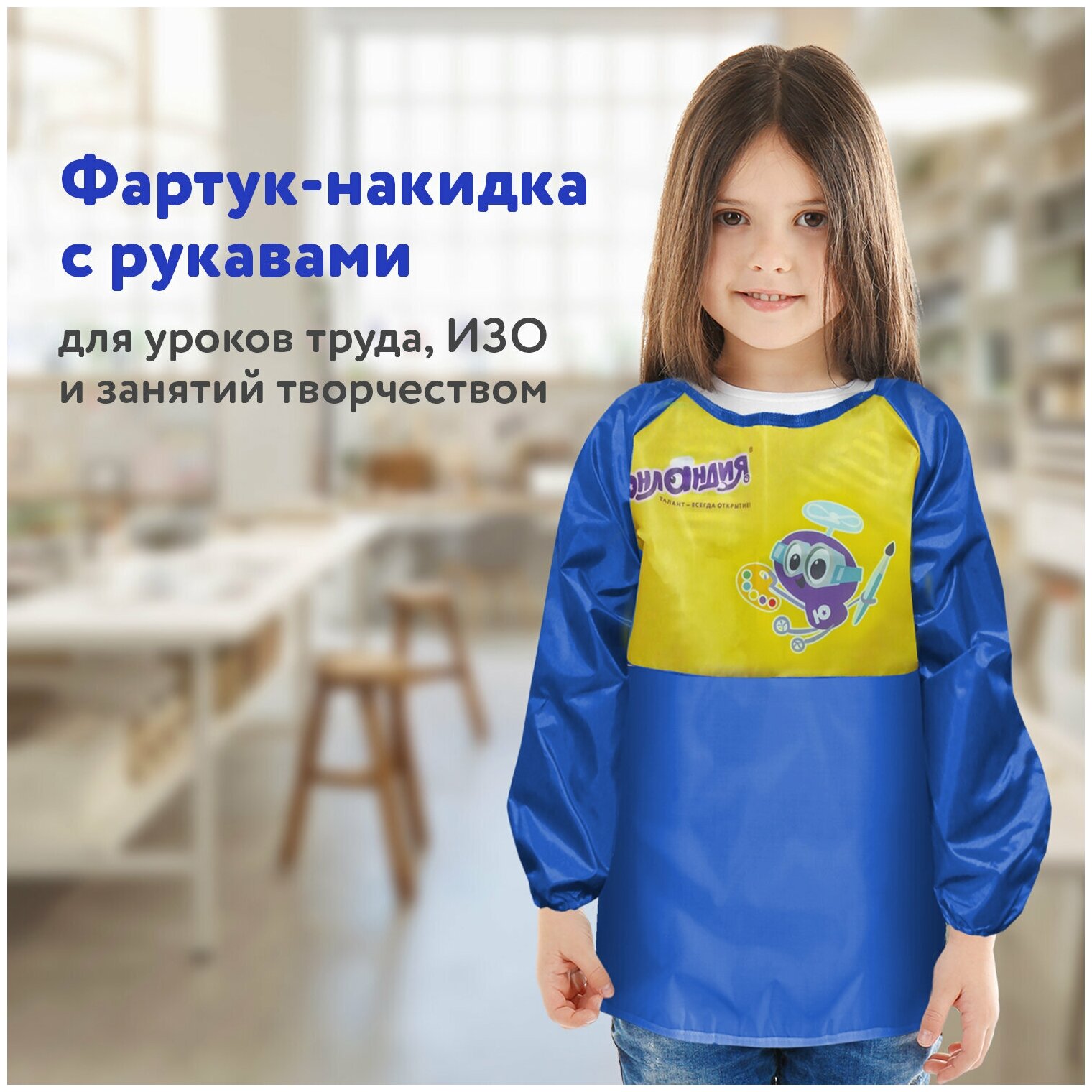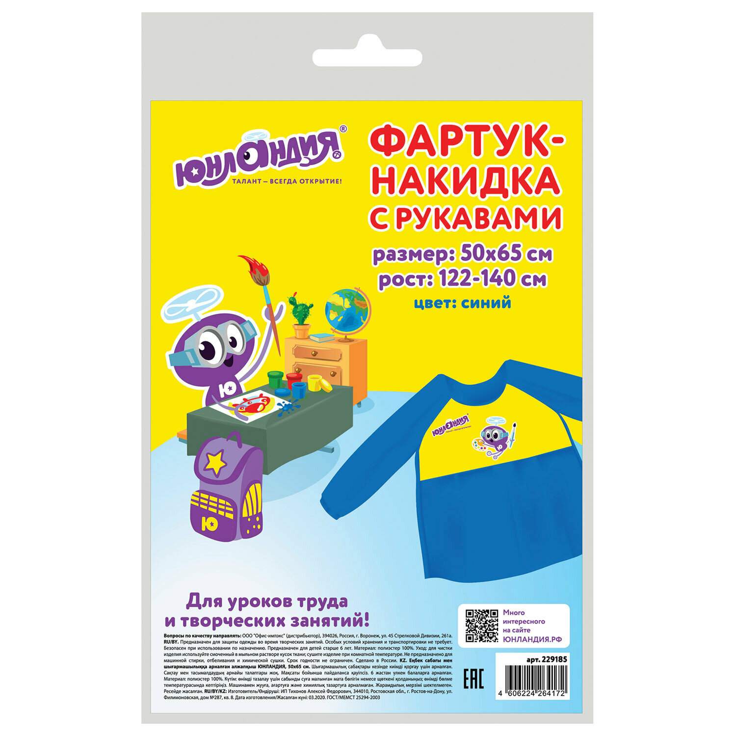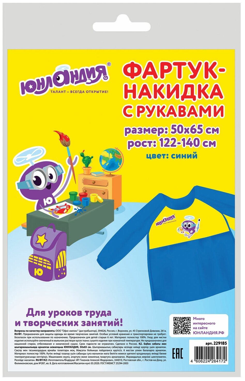 Фартук-накидка ЮНЛАНДИЯ - незаменимая вещь для защиты одежды на уроках труда и занятиях творчеством. Фартук изготовлен из водоотталкивающего материала, Предусмотрен для многоразового использования.