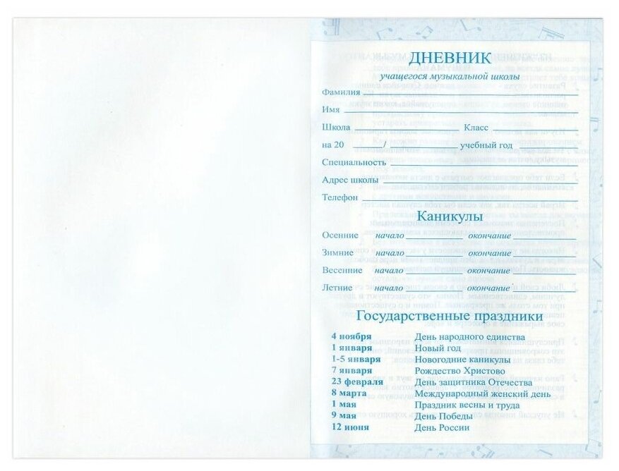 Действительно есть только поля для специальности, но нам так и надо было т.к учимся на двух инструментах, потому у нас два дневника))) Сам дневник не плохой, твердая обложка, странички не плотные, но и не рвутся при перелистовании. И он уже чем стандартные дневники на 3 см. Места для записи преподавателя много, хватает для записи и д/з и критики и советов. Пишу отзыв после учебного года потому страницы заполнены записями, хотя может это даже кому то будет полезней...