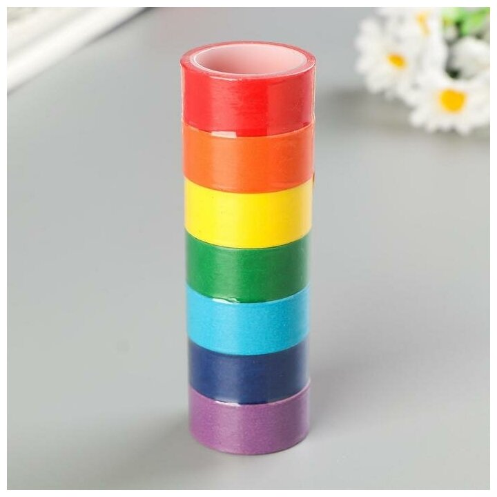 В наборе содержится 7 бумажных лент всех цветов радуги на полупрозрачной клеевой основе, каждая из которых намотана на пластиковую втулку. Ширина ленты 15 мм позволяет наклеить её даже на небольшие поделки, а длина 3 м даёт большой простор для творчества.