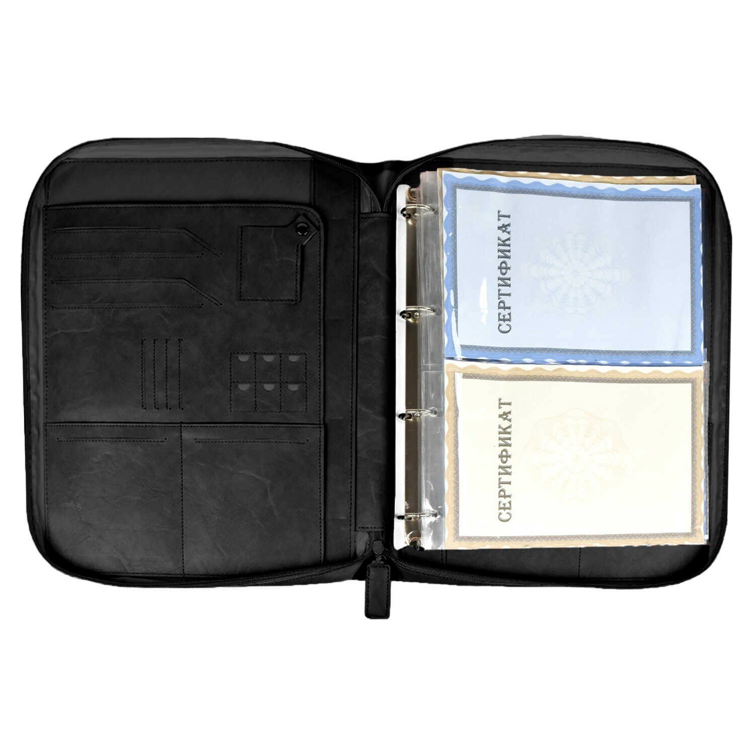Карман для карты памяти, карманы для визиток и документов, слоты для сим-карт, слоты для визиток и банковских карт.