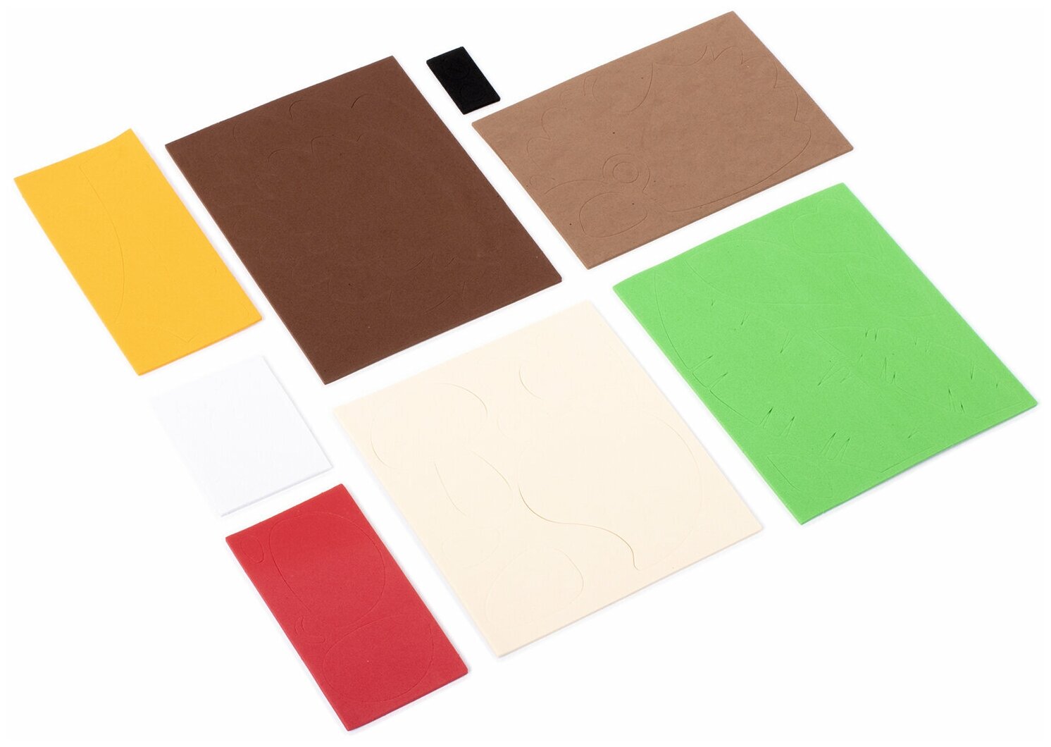 В набор входит яркая картонная основа размером 21х29 см с напечатанным дизайном аппликации, разработанным дизайнерами ЮНЛАНДИЯ специально для детей, а также 8 листов мягкого пластика разных цветов. Элементы аппликации перфорированы и имеют клеевой слой, что позволяет создать аппликацию без клея и ножниц.