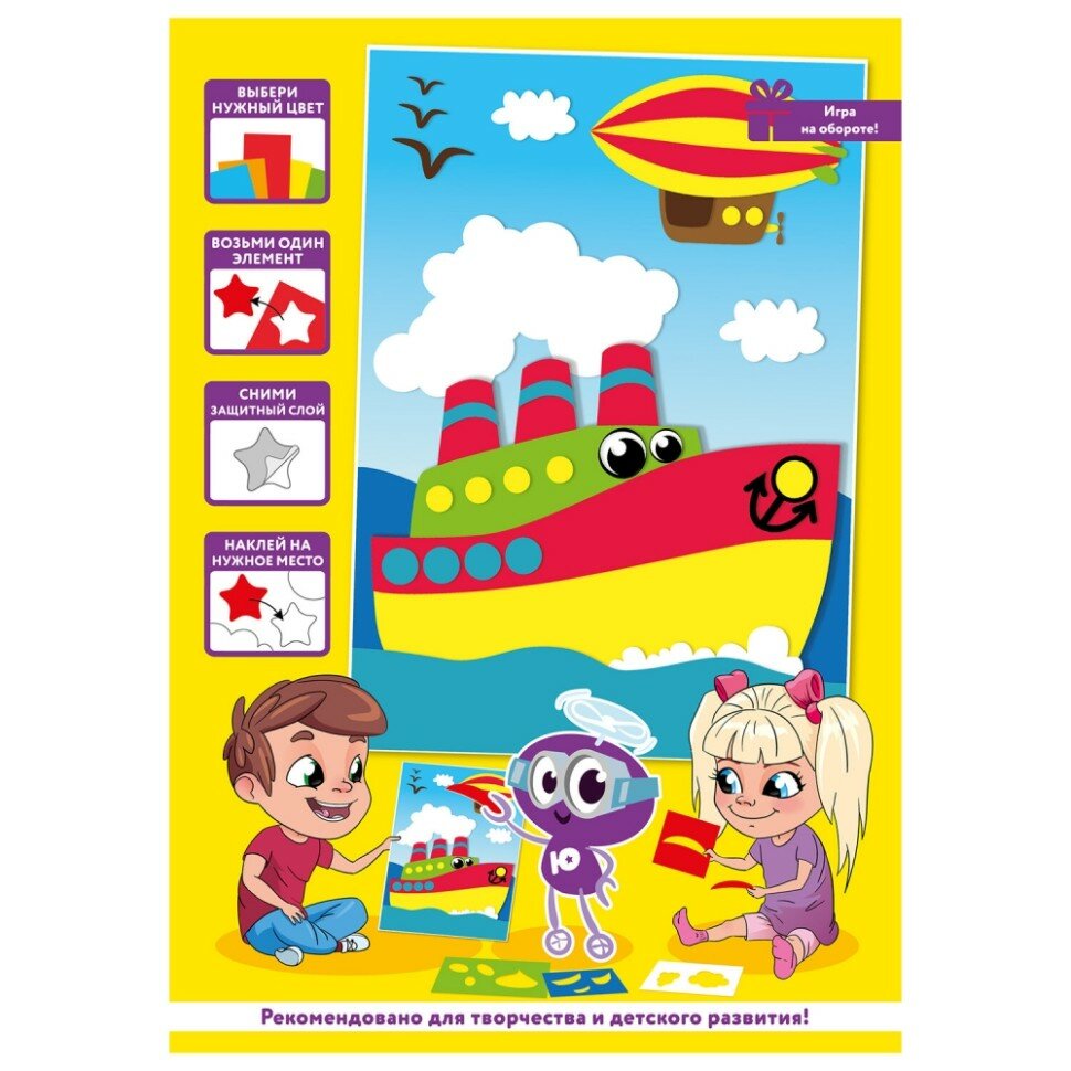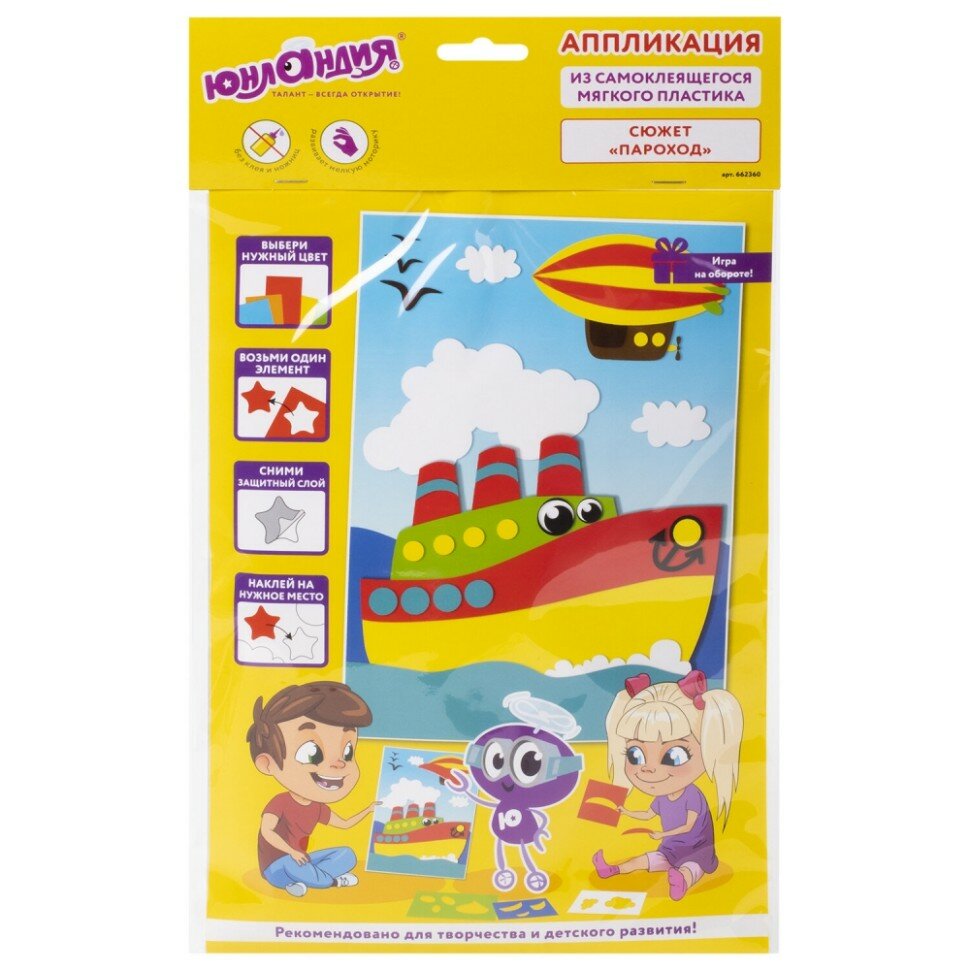 Аппликация из мягкого пластика EVA ЮНЛАНДИЯ "Пароход" - это весёлый и занимательный способ развития мелкой моторики, аккуратности, цветового восприятия и фантазии ребёнка. Все элементы в составе самоклеящиеся, для работы не требуются ножницы и клей.