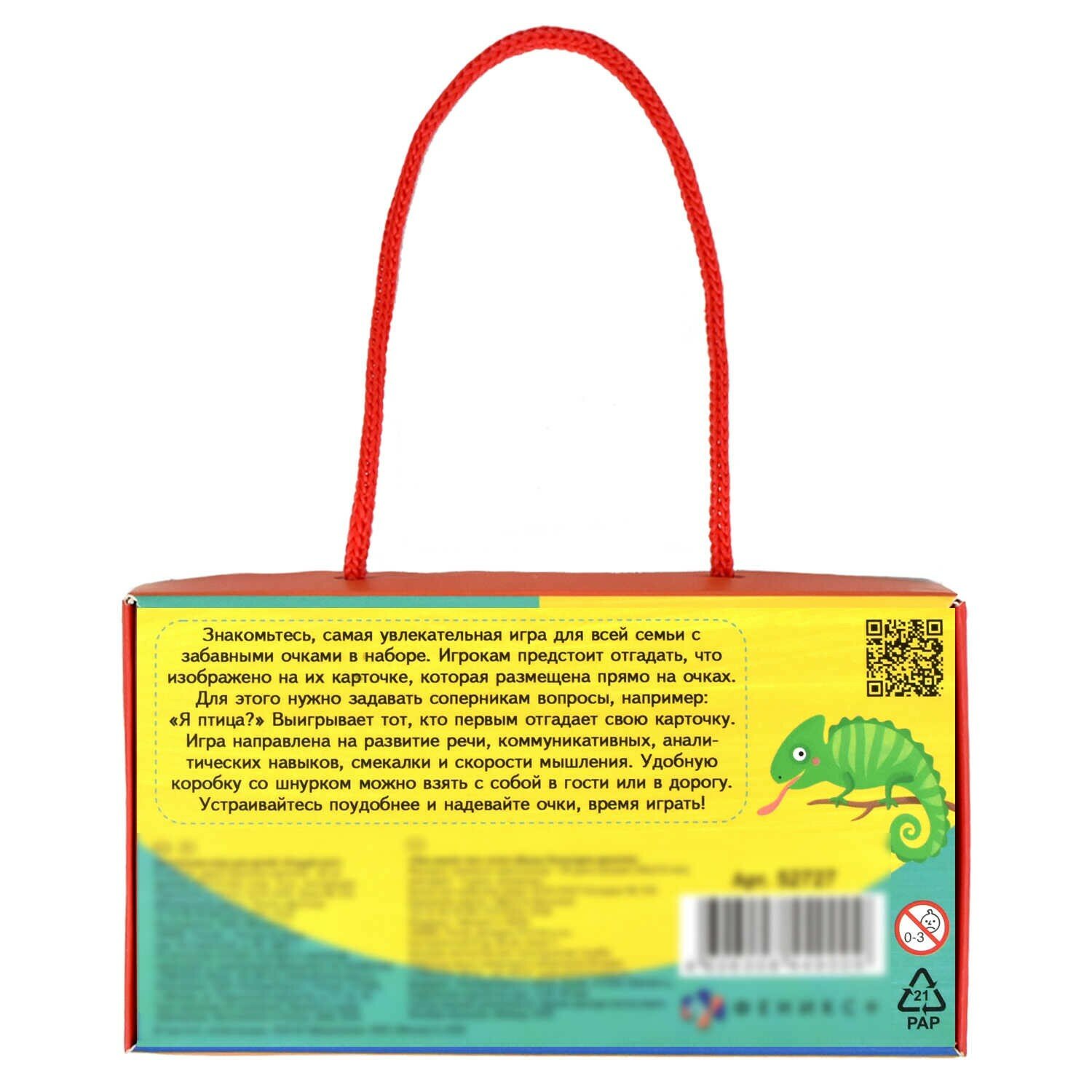 Знакомьтесь, самая увлекательная интерактивная игра для всей семьи с забавными очками в наборе. Игрокам предстоит отгадать, что изображено на их карточке, которая размещена прямо на очках. Для этого нужно задавать соперникам вопросы: например, «Я птица?». Выигрывает тот, кто первым отгадает свою карточку. Игра направлена на развитие речи, коммуникативных, аналитических навыков, смекалку и скорость мышления. Удобную коробку со шнурком можно взять с собой в гости или в дорогу. Устраивайтесь поудобнее и надевайте очки, время играть!