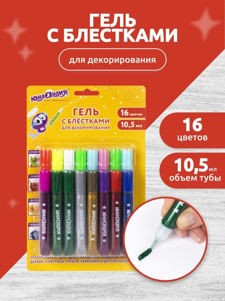 Гель с блёстками ЮНЛАНДИЯ - это блестящие наборы для творчества и украшения открыток, поделок, рисунков и подарков. Удобный наконечник с дозатором позволяет легко наносить гель на любую поверхность.