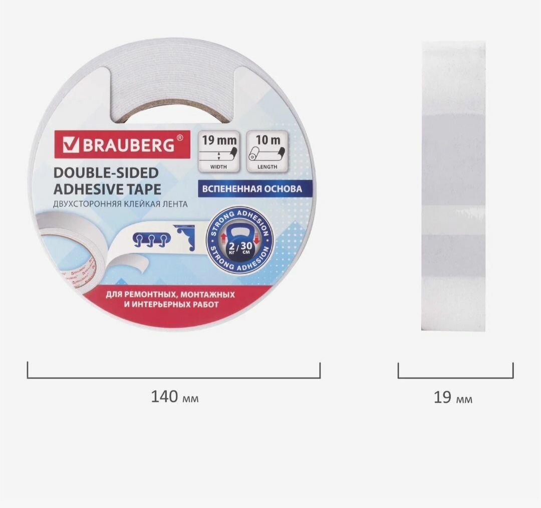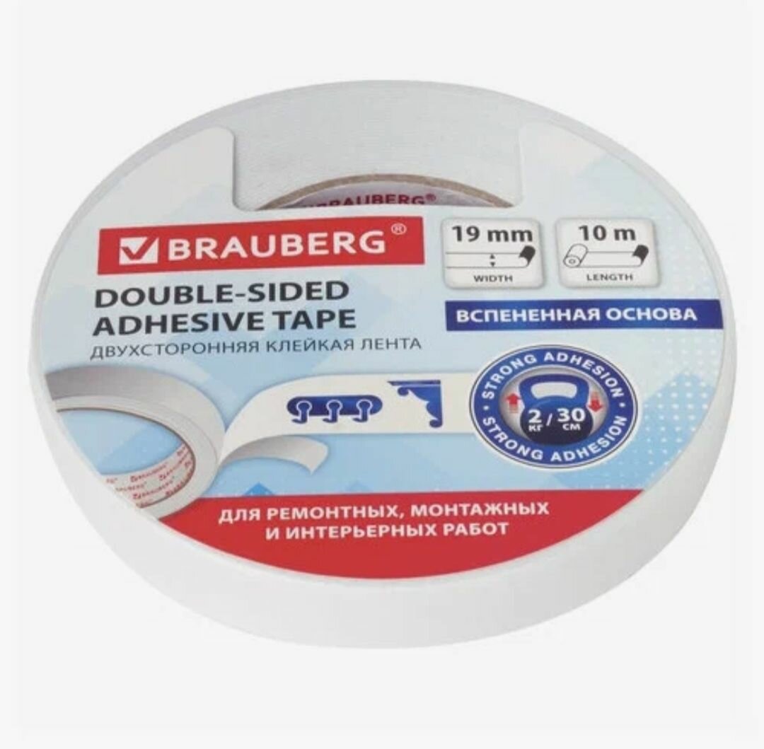 Двусторонняя клейкая лента на вспененной основе BRAUBERG применяется для оформительских и ремонтных работ, крепления постеров, мелкой фурнитуры и т.д.