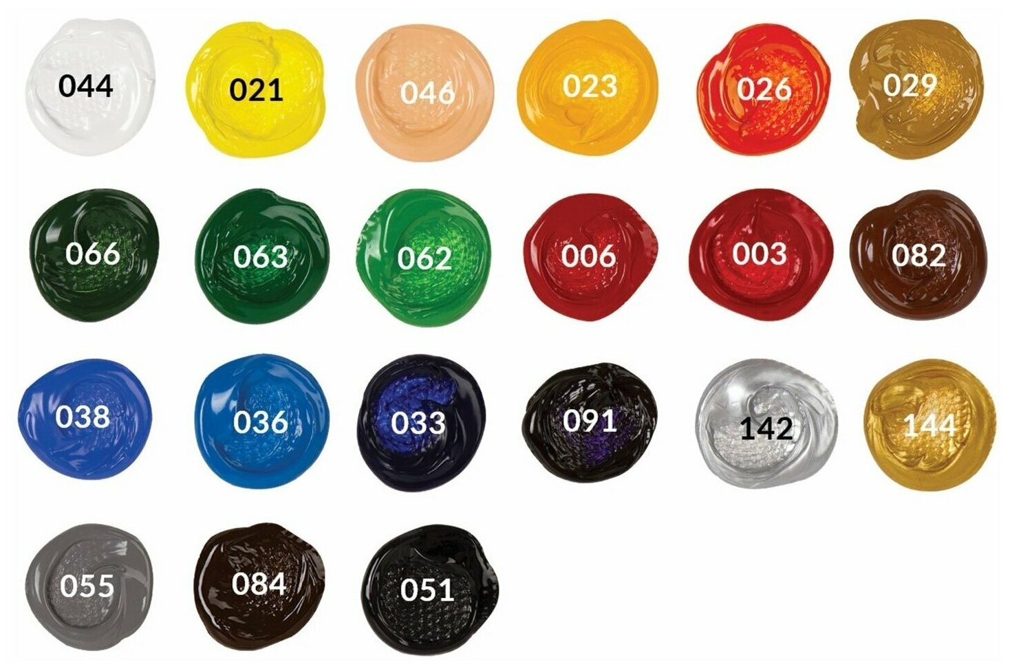 В наборе 21 цвет: - белила титановые (044) - 4 шт; - лимонная желтая (021); - желтая средняя (023); - телесная (046); - оранжево-желтая (026); - киноварь (006); - красная светлая (003); - фиолетовая темная (091); - церулеум (036); - кобальт синий (038); - ультрамарин (033); - зеленая светлая (062); - травяная зеленая (066); - зеленая средняя (063); - охра желтая (029); - сиена жженая (082); - умбра жженая (084); - серая (055); - черная (051); - серебристая (142); - золотистая (144);