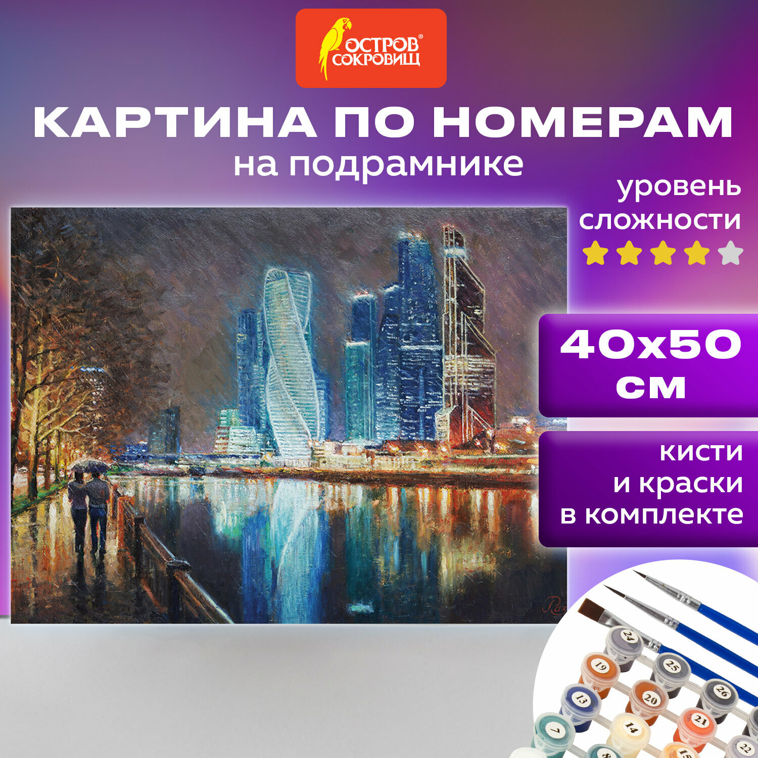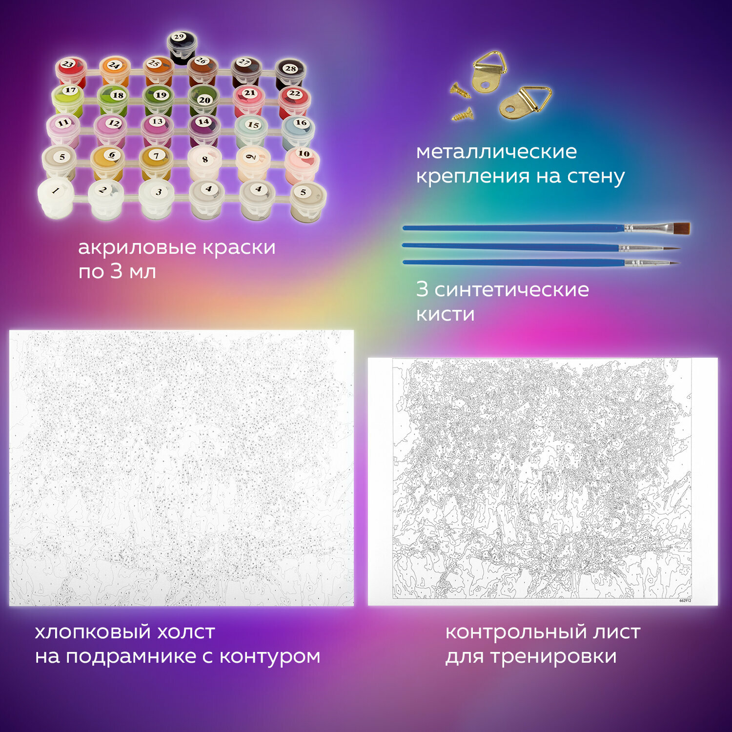 Комплектация: акриловые краски, кисть, крепеж, лист бумаги для тренировки, холст на подрамнике