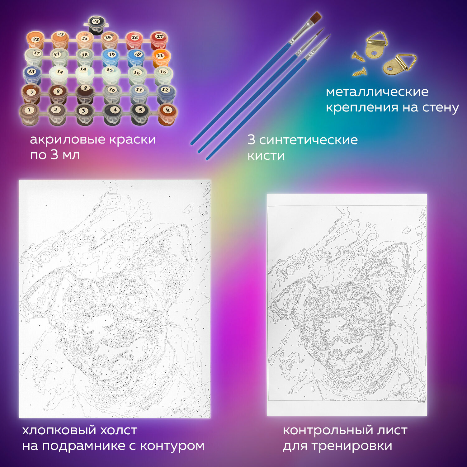 Комплектация: акриловые краски, кисть, крепеж, лист бумаги для тренировки, холст на подрамнике