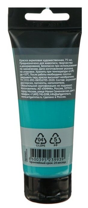 Краска акриловая "Студия" (75 мл) зеленая изумрудная (280220504) ГАММА