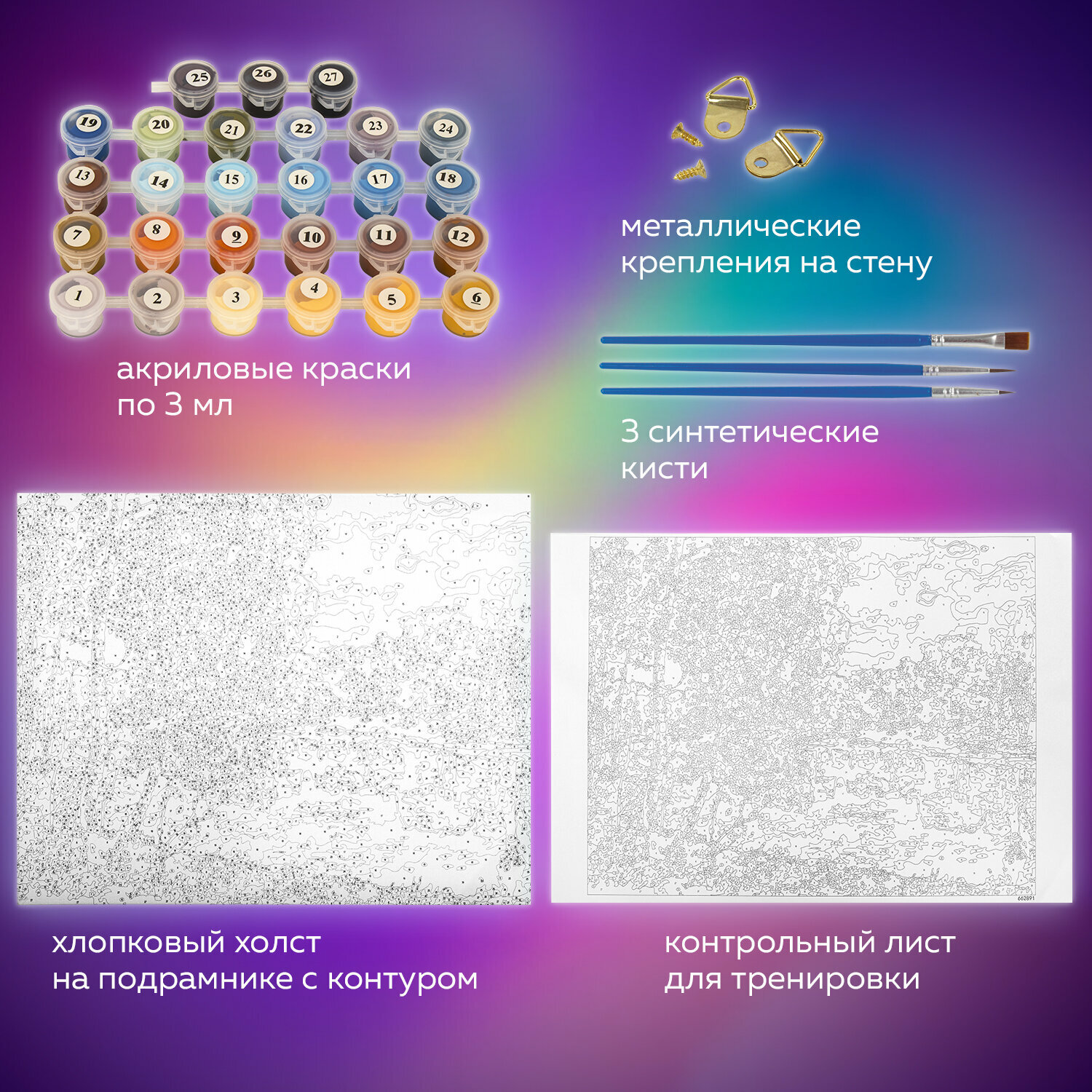 Комплектация: акриловые краски, кисть, крепеж, лист бумаги для тренировки, холст на подрамнике