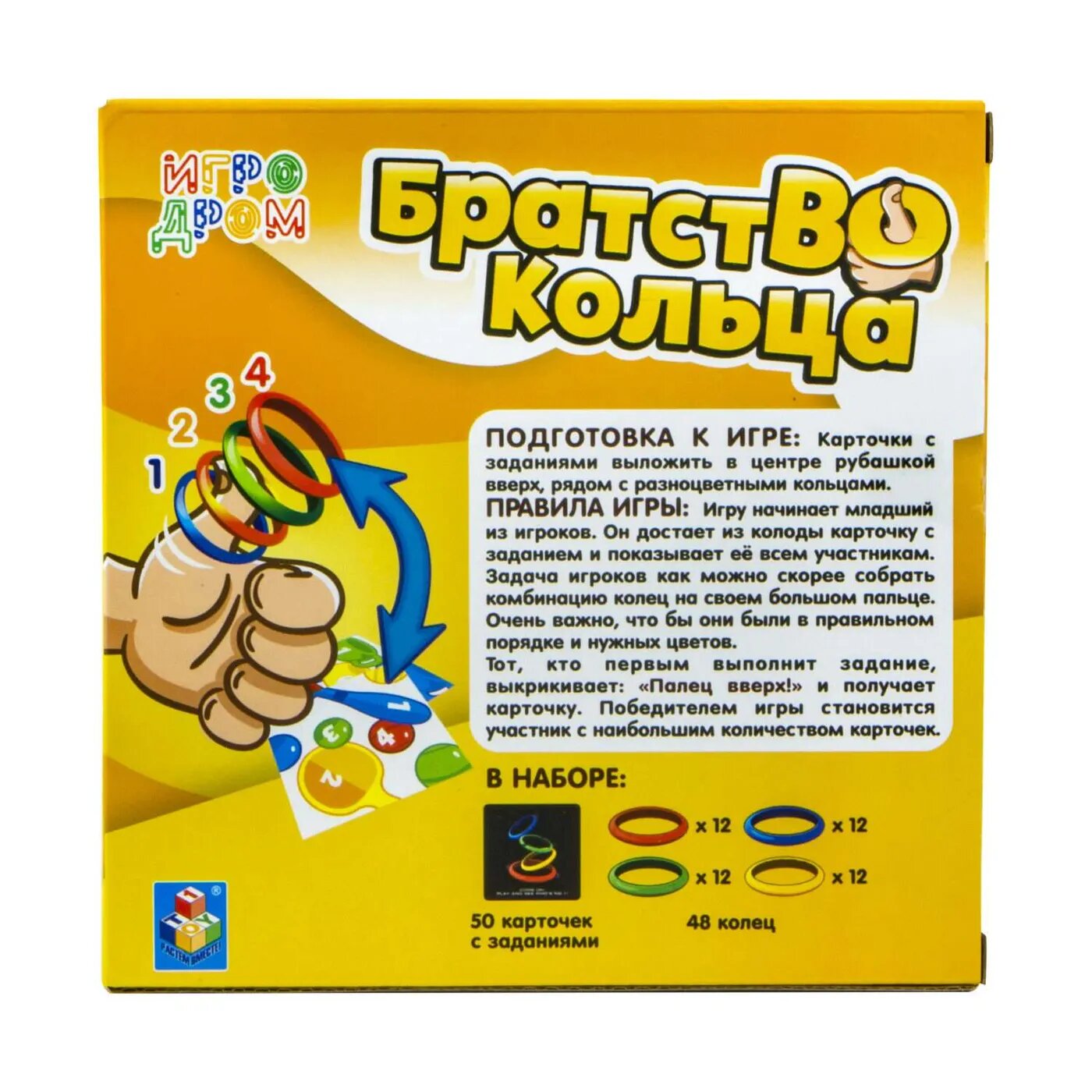 ПРАВИЛА ИГРЫ: Игру начинает младший из игроков. Он достает из колоды карточку с заданием и показывает её всем участникам. Задача игроков как можно скорее собрать комбинацию колец на своем большом пальце. Очень важно, что бы они были в правильном порядке и нужных цветов.