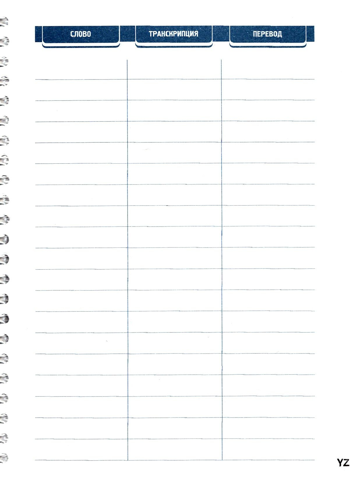 Тетрадь для записи иностранных слов, 80 листов, формат А5, плотность 60 гр/м2. Внутренний блок - высококачественная белая офсетная бумага. Линовка блока - линейка голубого цвета, на странице 3 столбца: слово, транскрипция, перевод. Высечка латинского алфавита. Обложка - мелованный картон, полноцветная печать. Крепление - металлическая евроспираль в ПВХ-оплетке.