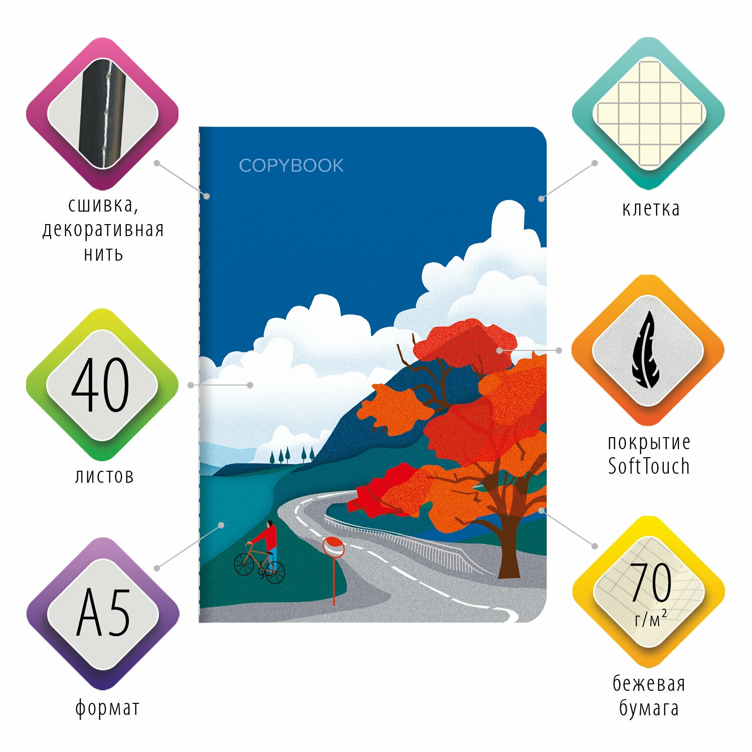 Общая тетрадь формата А5 содержит 40 листов с линовкой в клетку. Сшивка плотно соединяет листы. Обложка изготовлена из высококачественного импортного картона с двусторонней запечаткой, что придает тетради изысканный и неповторимый стиль. Специальное покрытие "SoftTouch" с повышенными тактильными свойствами, придает обложке мягкий, бархатистый эффект. Внутренний блок - тонированная офсетная бумага цвета слоновой кости плотностью 70 г/м2.