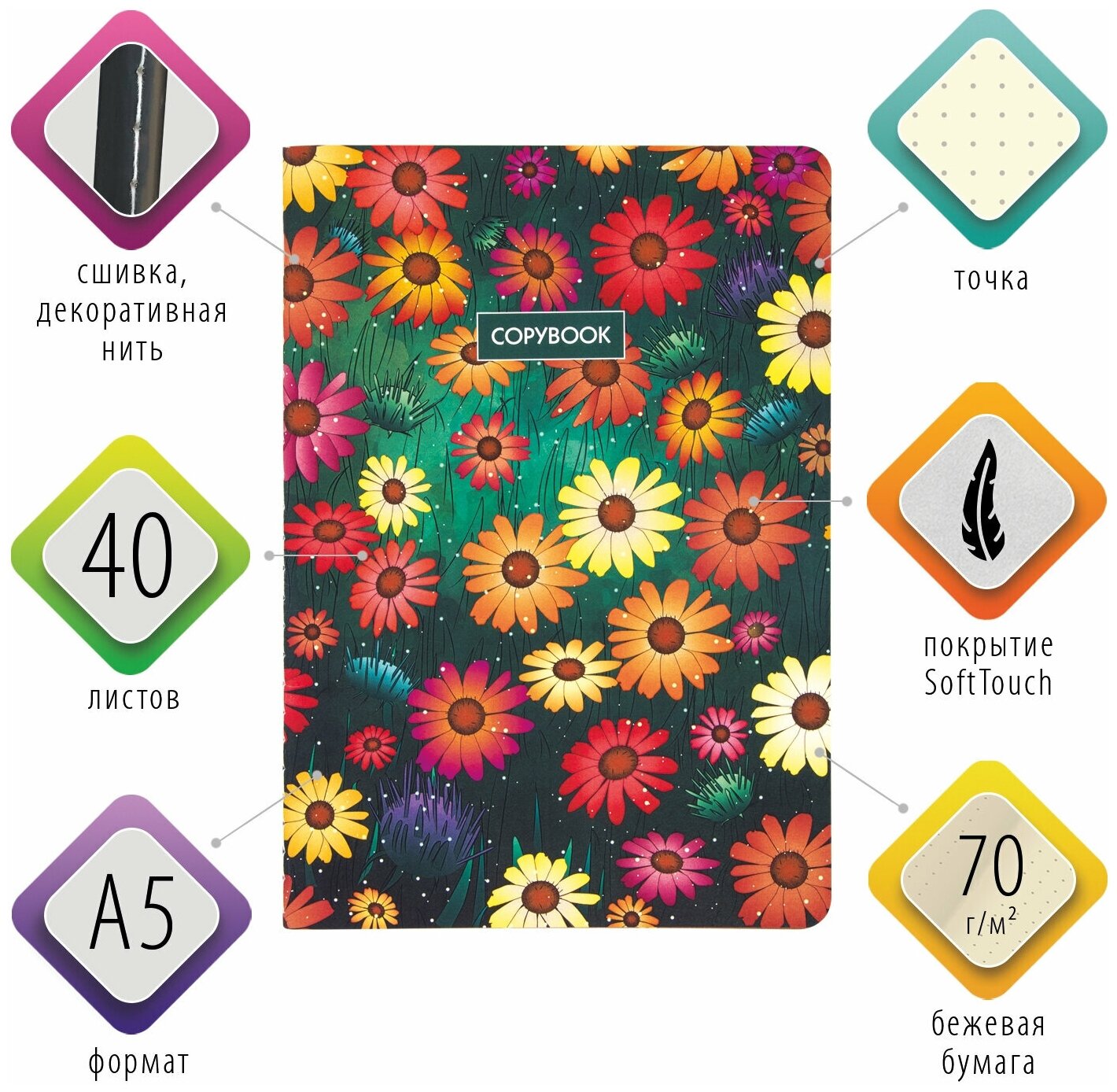 Общая тетрадь формата А5 содержит 40 листов с линовкой в точку. Сшивка плотно соединяет листы. Обложка изготовлена из высококачественного импортного картона с двусторонней запечаткой, что придает тетради изысканный и неповторимый стиль. Специальное покрытие "SoftTouch" с повышенными тактильными свойствами, придает обложке мягкий, бархатистый эффект. Внутренний блок - тонированная офсетная бумага цвета слоновой кости плотностью 70 г/м2.