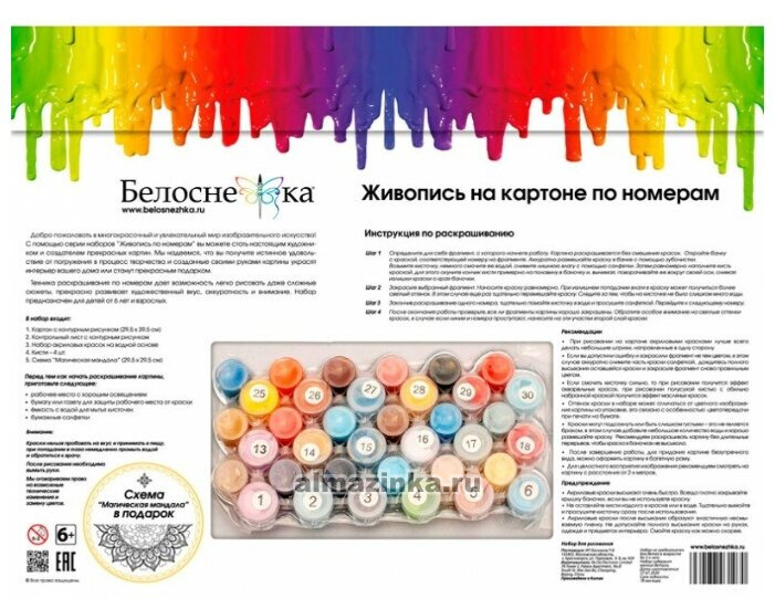 Цифрорисовашка устроена предельно просто: на основу из картона приклеена белая бумага, на которую нанесена схема, разбитая на пронумерованные сектора. Живопись по номерам 30х40 см. комплектуется акриловыми красками на водной основе, которые не обладают резким и неприятным запахом, что, в первую очередь, гарантирует безопасность при использовании красок.