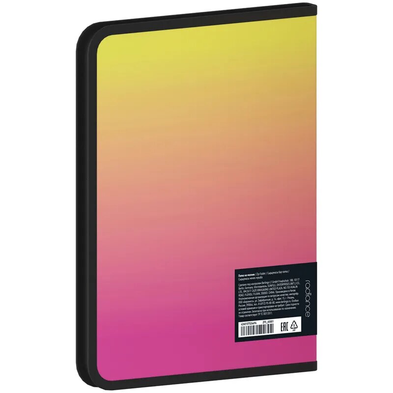 Папка на молнии Berlingo серии Radiance формата А5+ идеальна для хранения и транспортировки документов. Снаружи папка имеет жёлтый/розовый градиент, внутри - чёрный цвет. Изделие размером 245*200*10 мм изготовлено из высококачественного полипропилена толщиной 600 мкм с матовой текстурой поверхности "песок", на которой не видно отпечатков пальцев и мелких царапин. Папка имеет надежную молнию с мягким ходом.Изделие вмещает 300 листов. Индивидуальная упаковка в пакет. • Вместимость, в листах: 300;• Материал: пластик;• Наличие ручки: нет;• Размер: 245*200*10 мм;• Способ фиксации: молния;• Текстура: песок;• Толщина материала: 600 мкм;• Формат: А5+;• Цвет канта: чёрный;• Цвет папки: жёлтый/розовый градиент.
