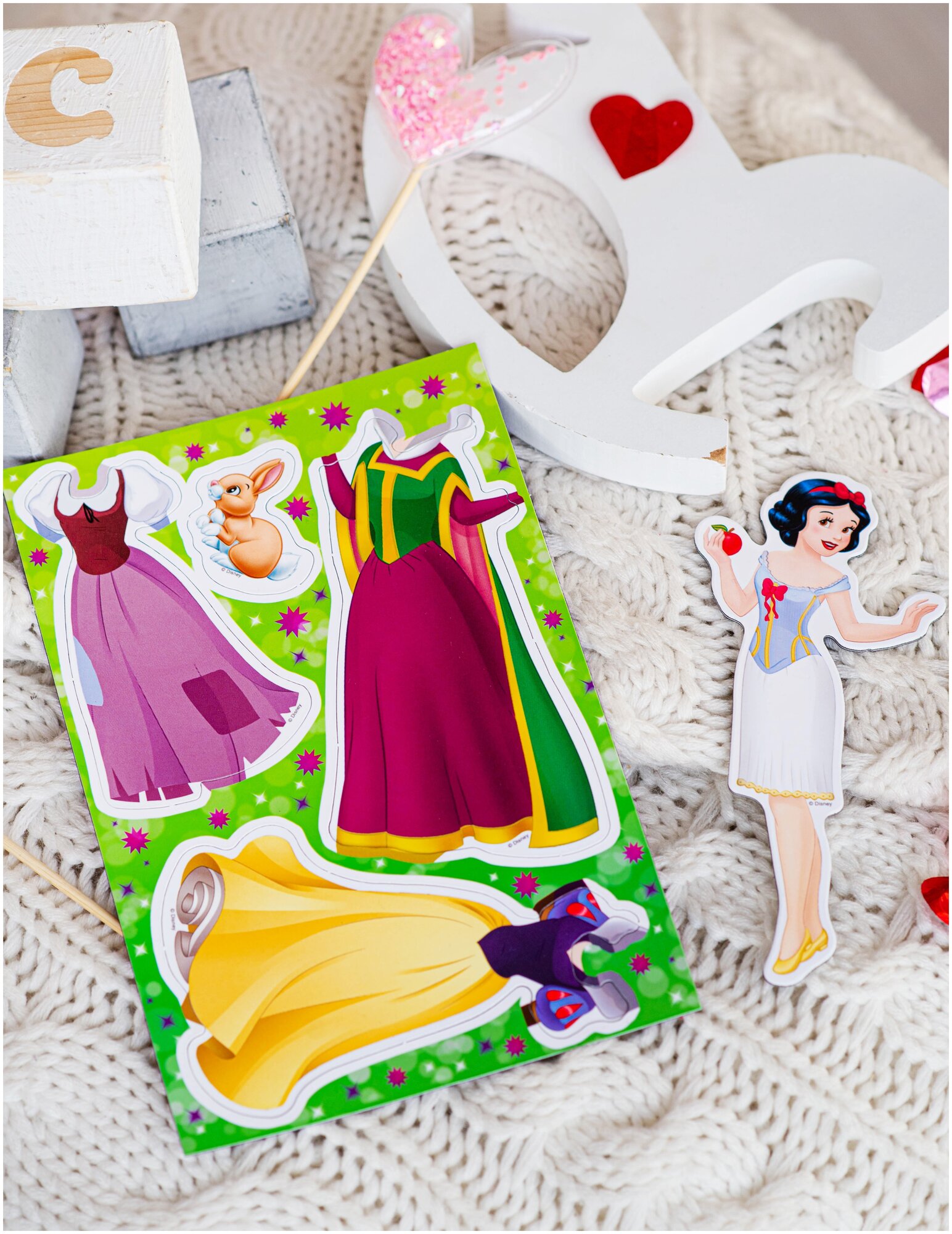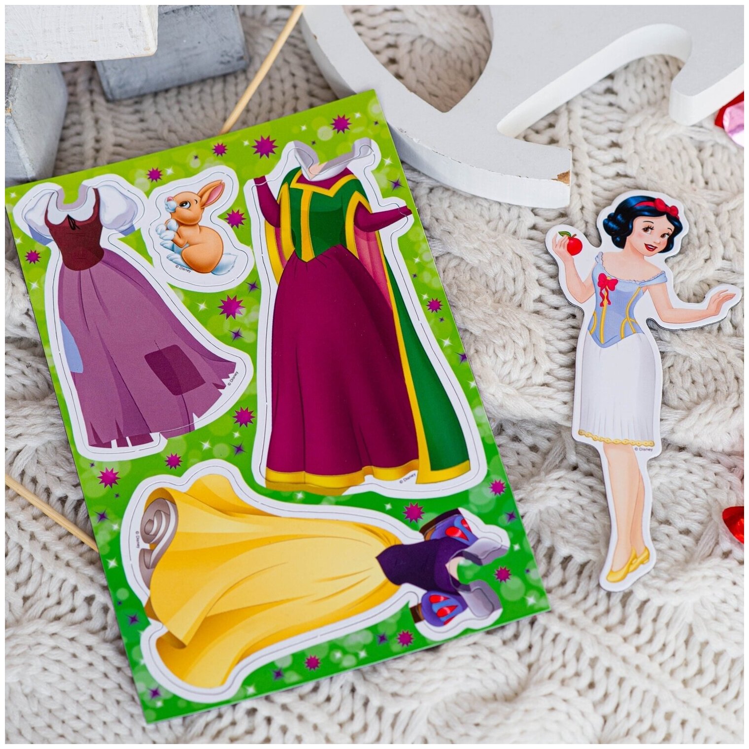 На магнитной основе в виде героев мультфильма Дисней ребенок сможет примерить на игрушку разный дизайн одежды.