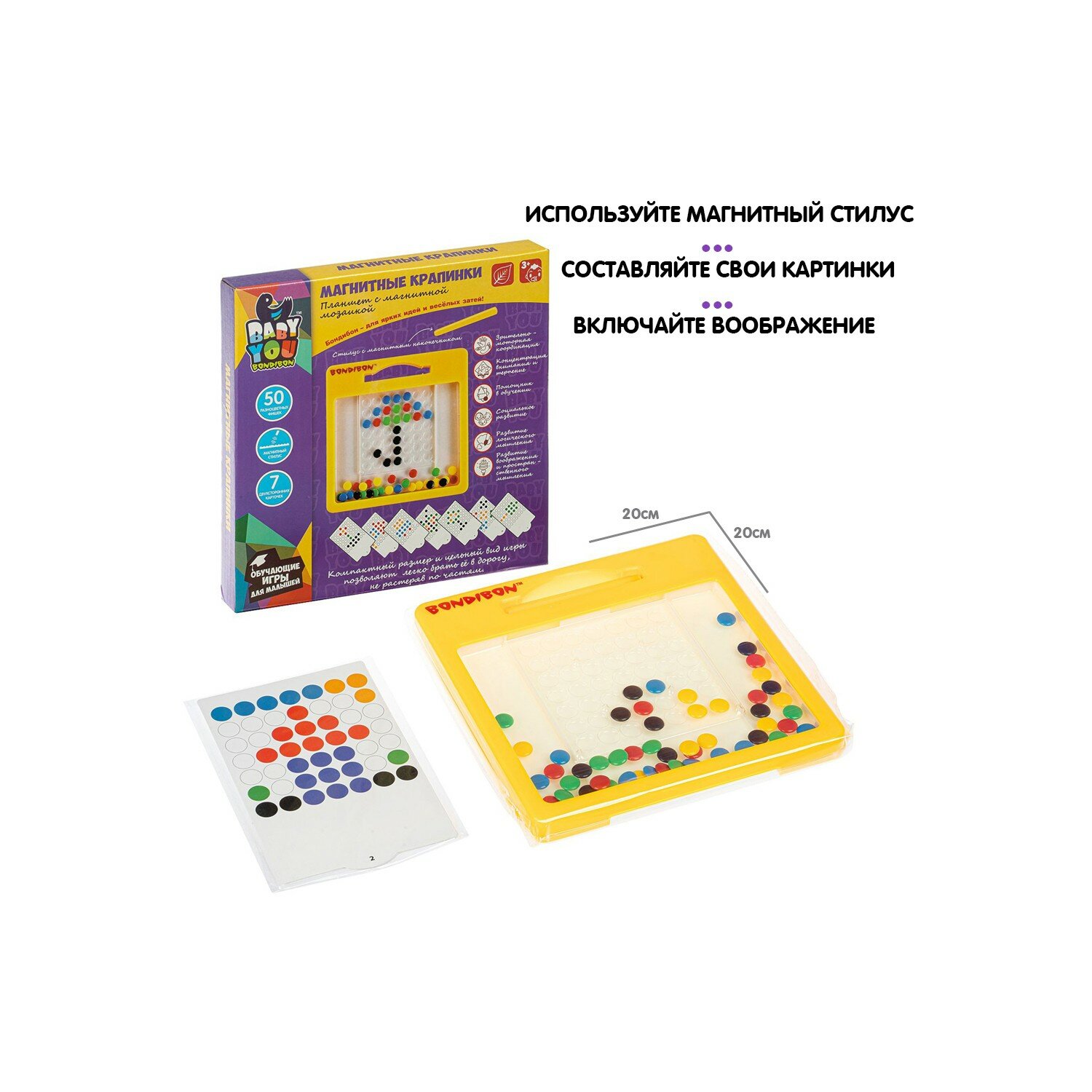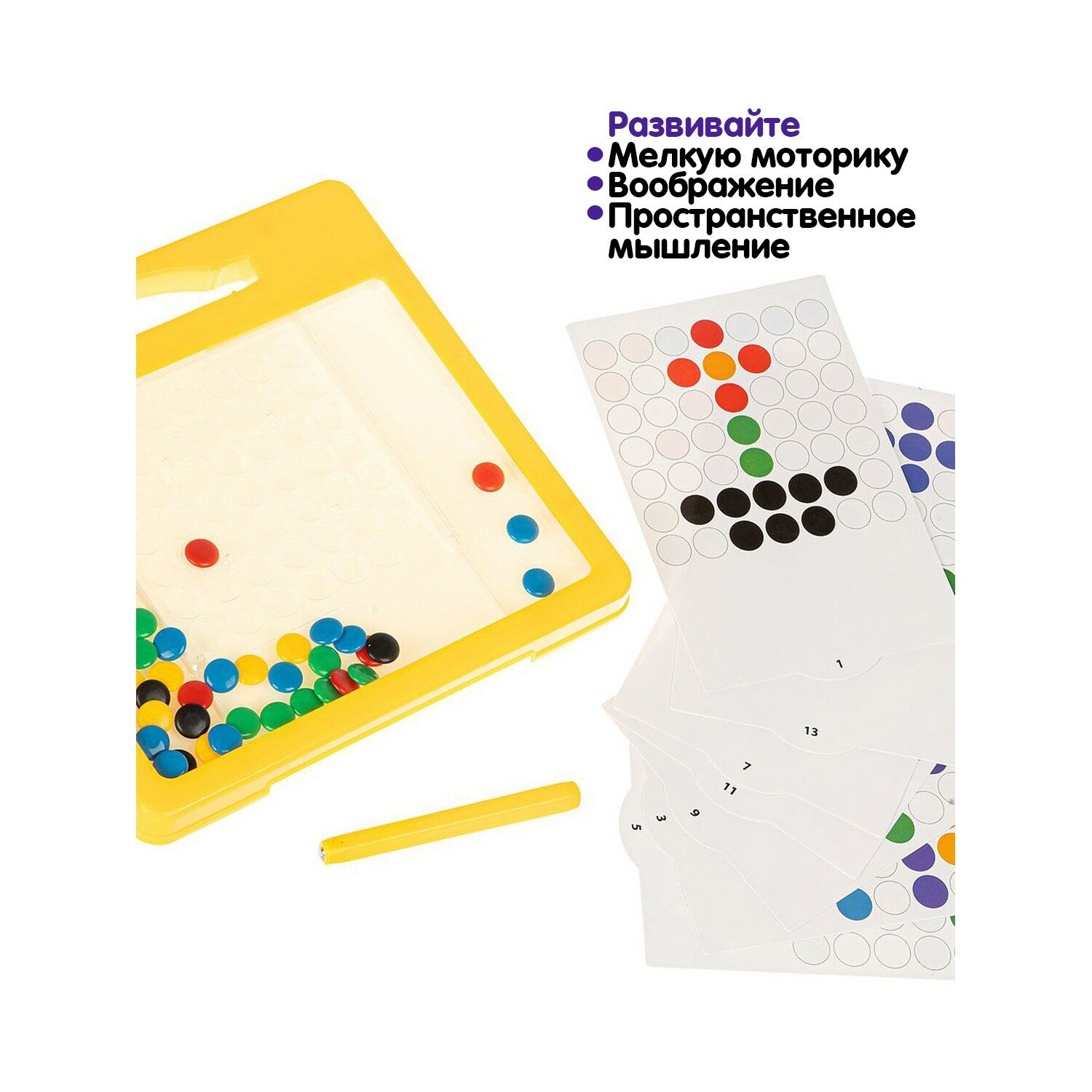 В комплект входит планшет 20х20 см с 50 цветными фишками внутри, 7 двусторонних карточек с заданиями, стилус-магнит.