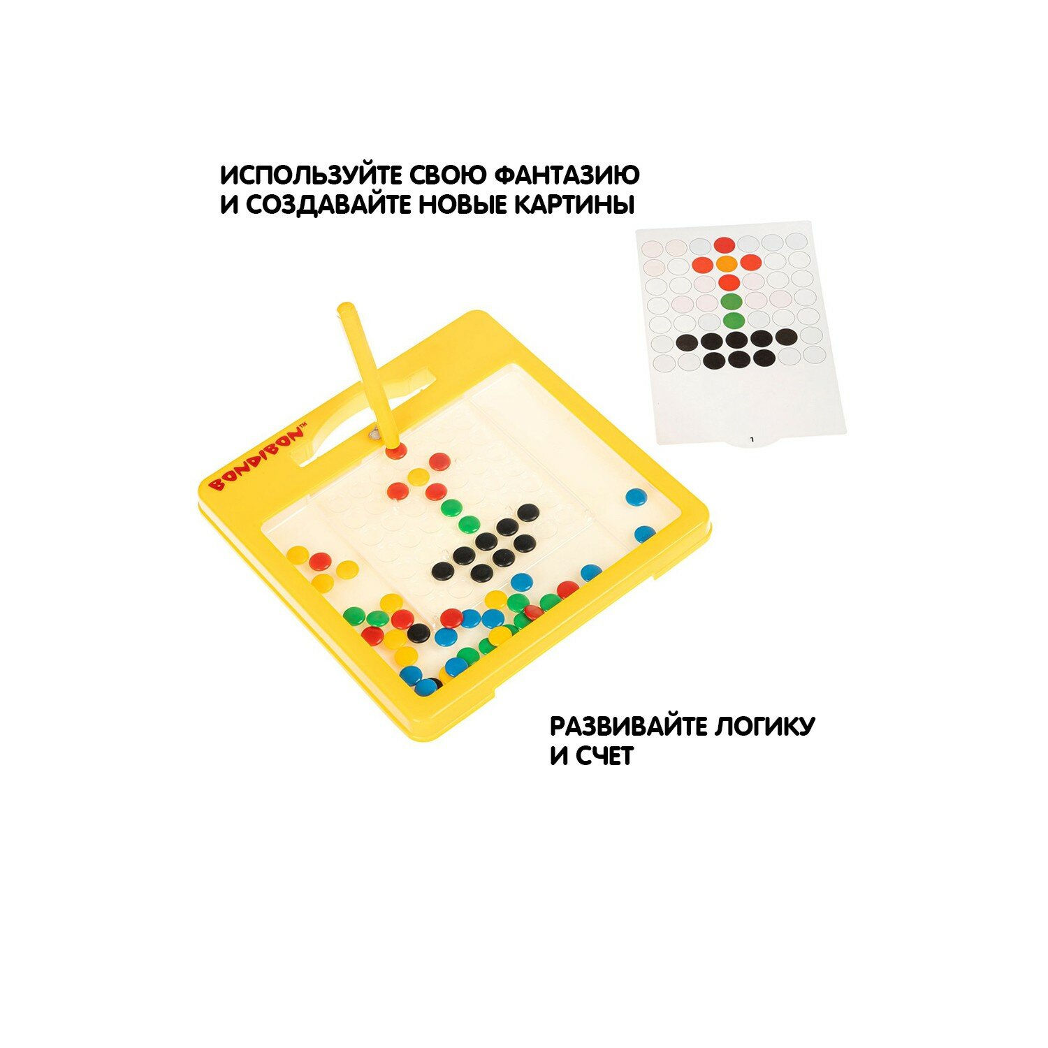 Магнитным наконечником стилуса притягивайте металлические фишки и перемещайте в нужные ячейки игрового планшета. Для создания красочных картин в комплекте идут фишки пяти цветов, по 10 штук каждого цвета.