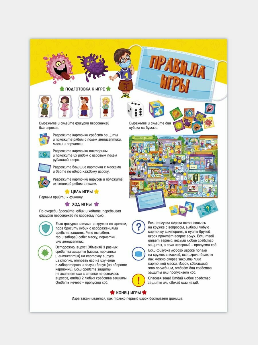 Игра-ходилка с викториной «Вирус в городе»- это увлекательная и полезная игра, которая научит малышей мерам защиты от разных вирусов! Вооружившись масками, ребята исследуют вредителей и научатся основам безопасно находиться в людных местах.
