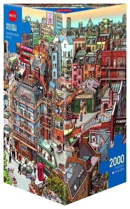 Пазл в интересной треугольной коробке, картон плотный. Снаружи затянут в пленку производителем. Коробка довольно внушительная (смотрите размеры в описании). На одной стороне коробки приведена полностью картинка, которую нужно собрать. На других сторонах части картинки. Сама картинка впечатляет, множество мелких деталей улиц Лондона, тут тебе и английский бульдог и Юнион Джек и леди, пьющие чай и Биг Бен на заднем плане и макет динозавра, привезенный в музей. Ну и конечно Шерлок Холмс и доктор Ватсон, ведущие расследование (срисованы с героев современного английского сериала "Шерлок"). Так как пазл куплен в подарок под елку ничего не могу сказать про сами пазлы. Но, перед заказом читала тематические форумы, в принципе отрицательных отзывов не видела. Пазл входит в серию Puzzle + Poster поэтому внутри коробки должна быть большая картинка для сборки пазла.
