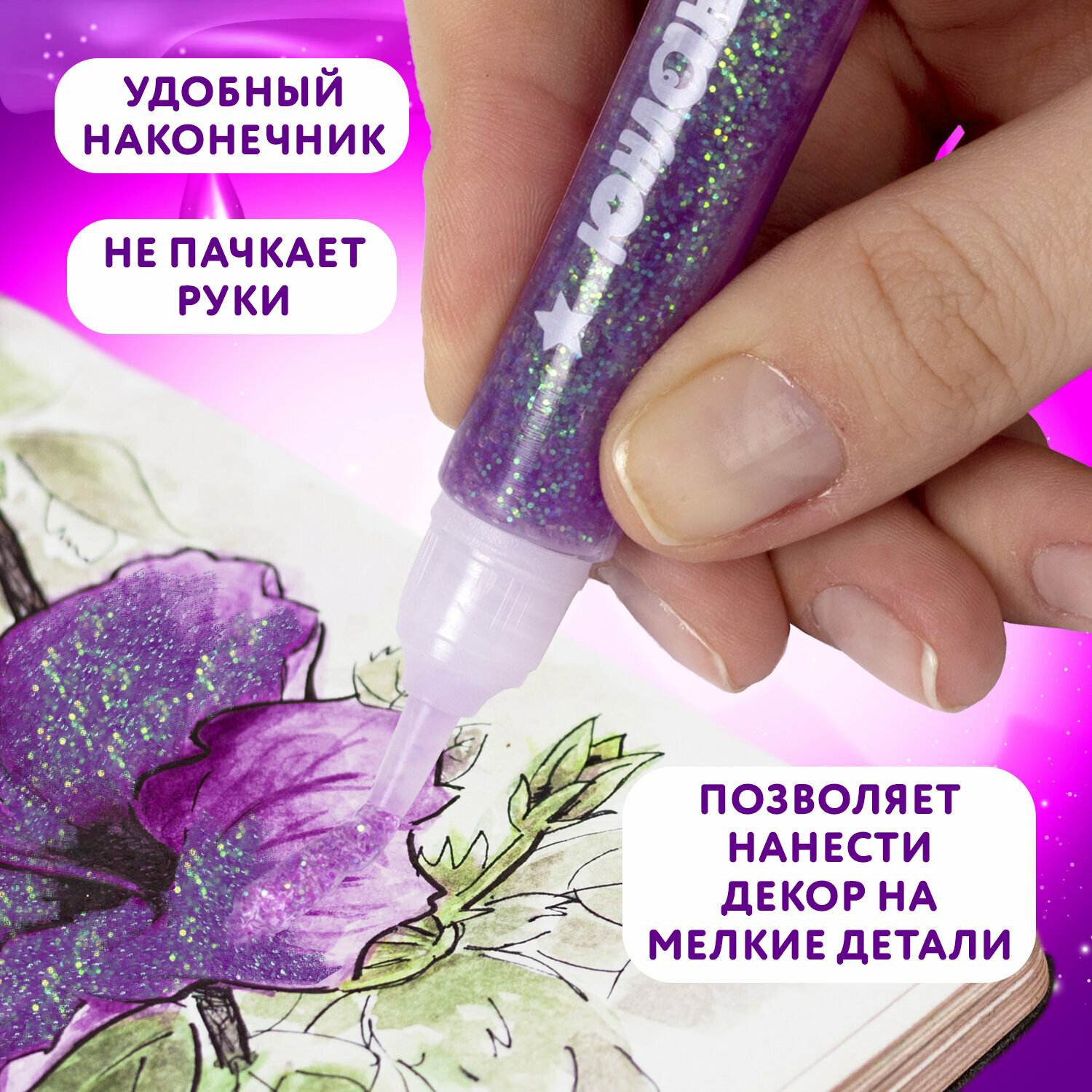 Гель с блёстками ЮНЛАНДИЯ - это блестящие наборы для творчества и украшения открыток, поделок, рисунков и подарков. Удобный наконечник с дозатором позволяет легко наносить гель на любую поверхность.