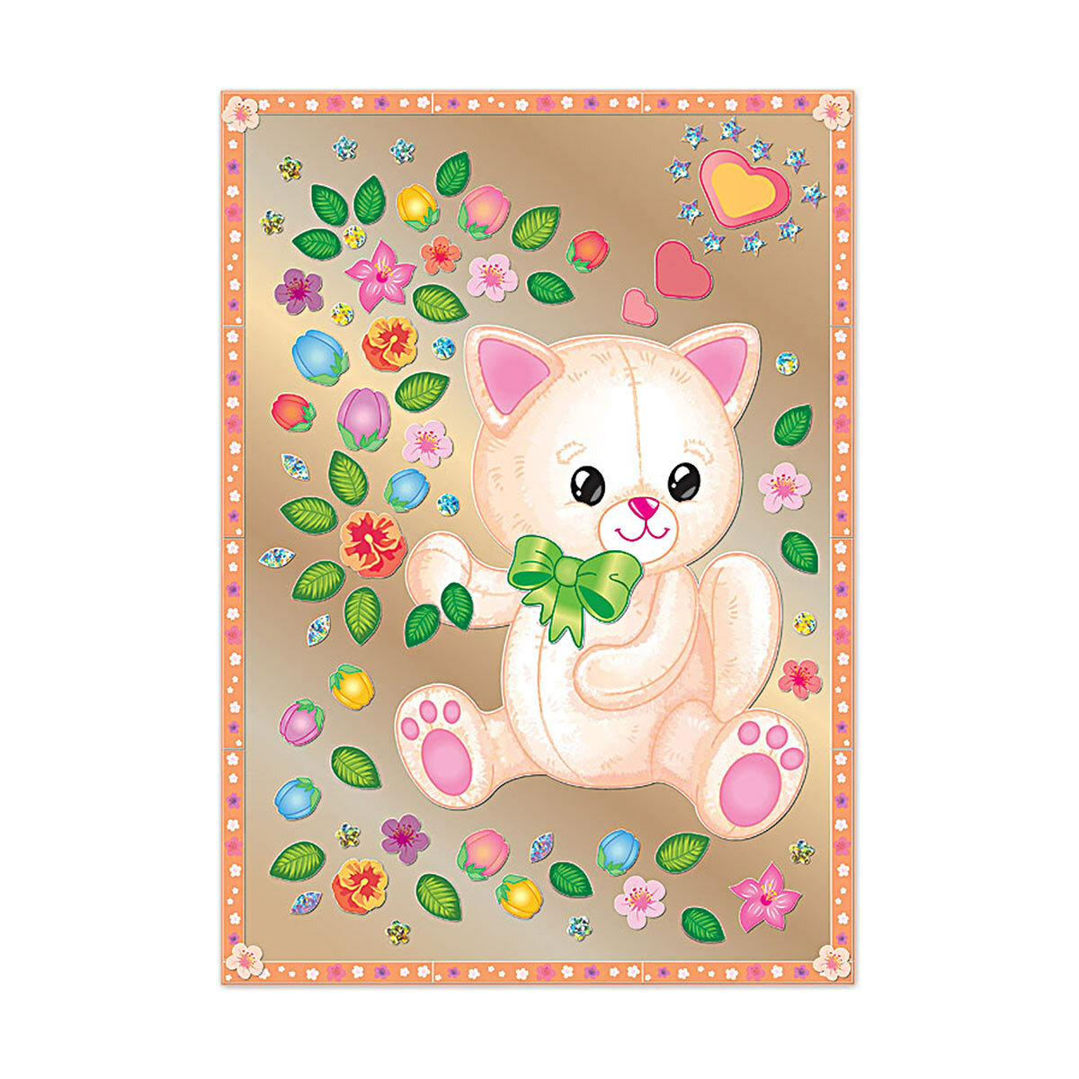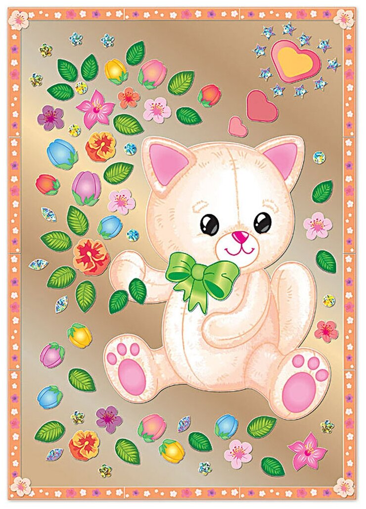 Работа над картиной проста и приятна, ведь клей и ножницы не понадобятся: дети наклеят на фон-пластик рамку из узорных цветных полосок и цветов, затем фигурку милой плюшевой зверушки-котика с разноцветными сердечками, на котика наклеят бант и заполнят пространство вокруг персонажа стилизованным воздушным букетом из цветов, бутонов и листьев.