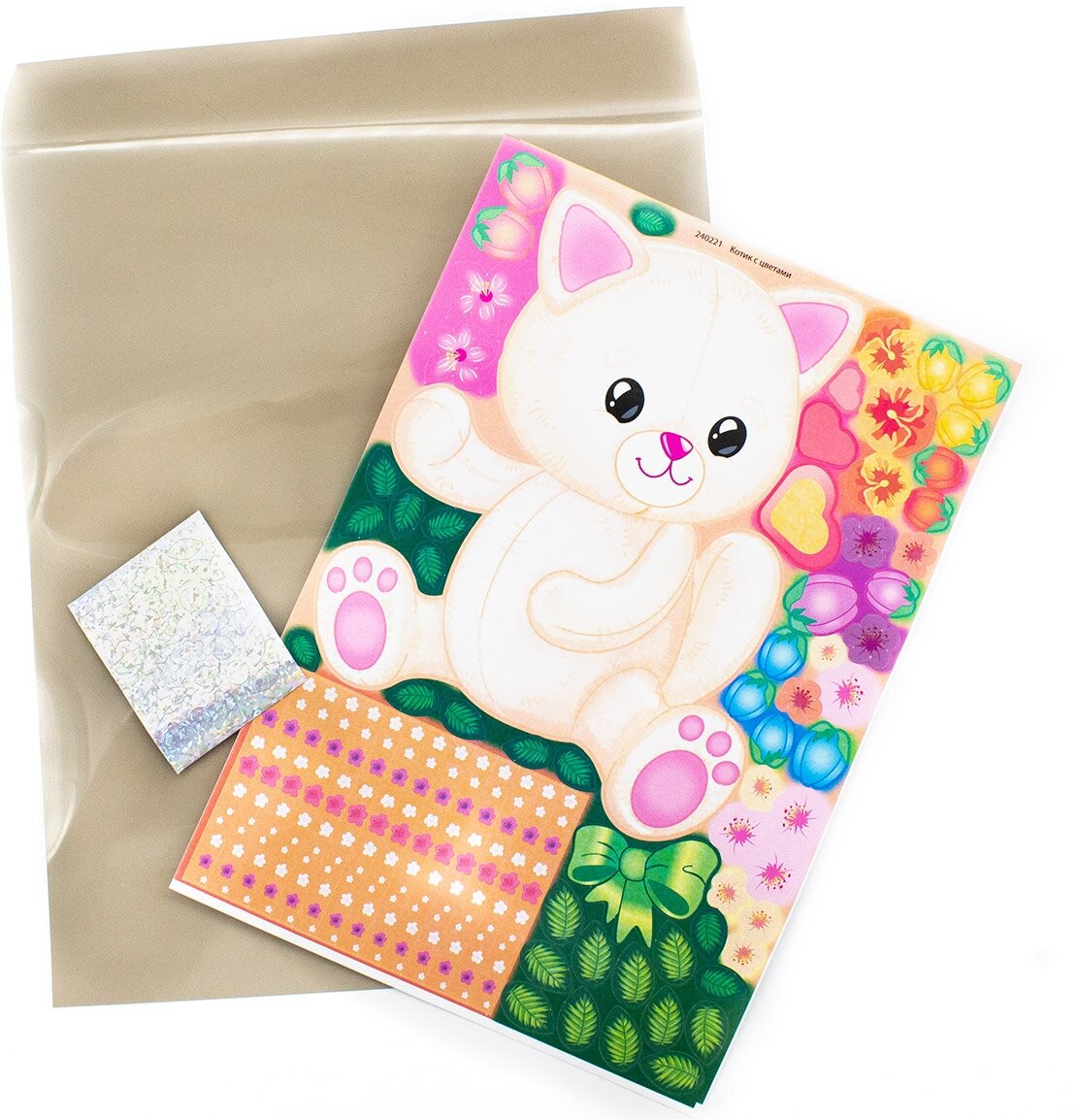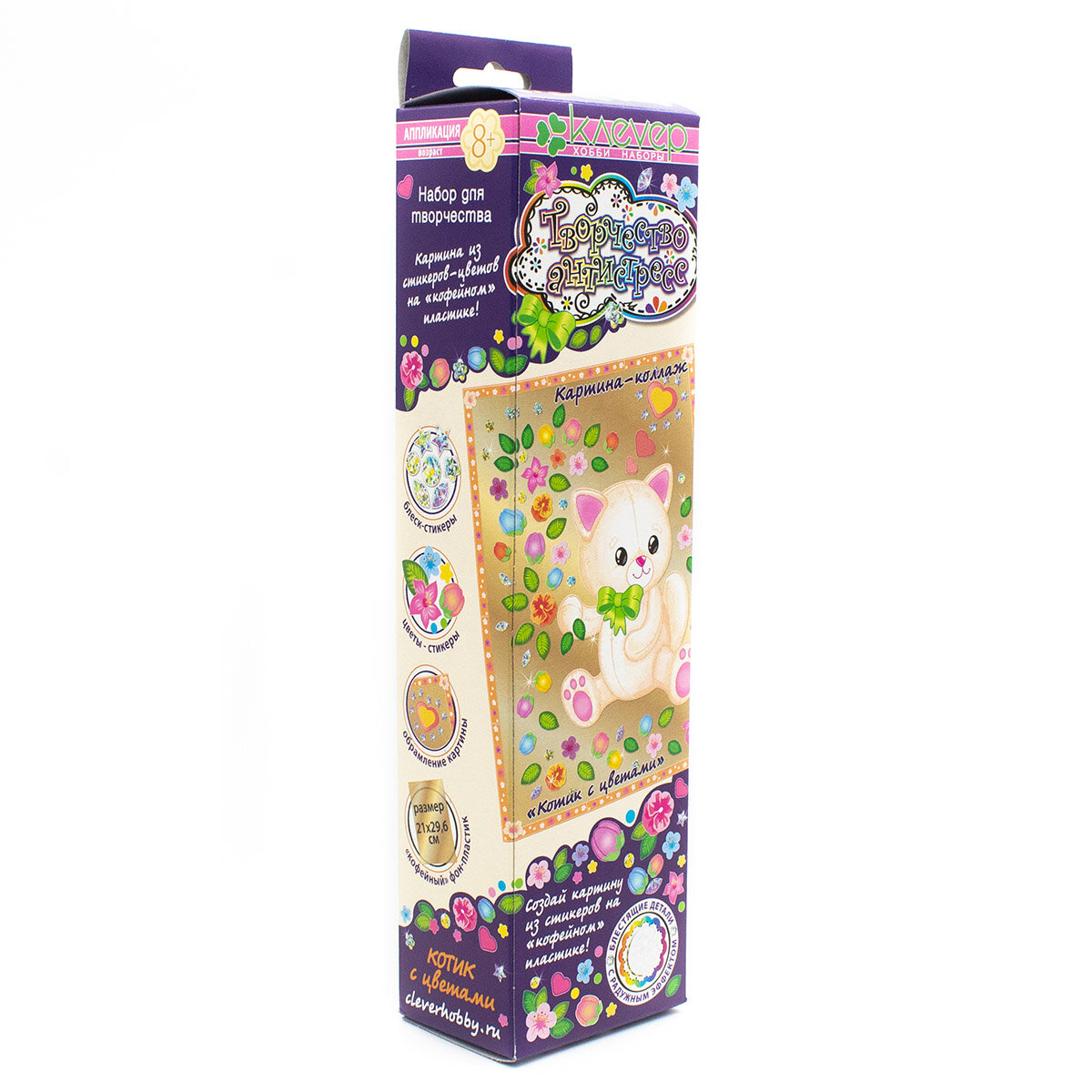 Набор «Котик с цветами» для маленьких творцов старше 8 лет - это возможность выразить себя с помощью оригинальной техники «Антистресс-декорирование стикерами» (© Клевер)!