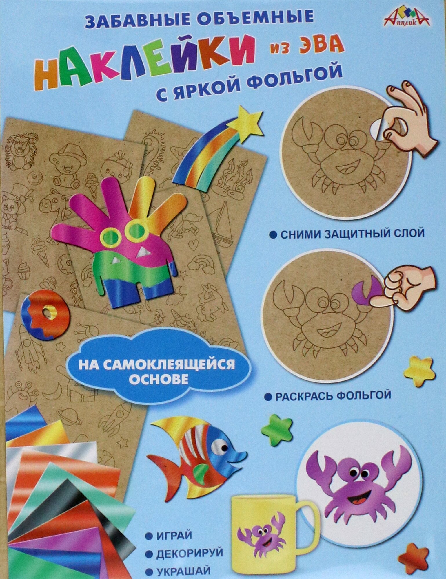 О товаре Объемные наклейки Апплика Космическое путешествие – прекрасное решение для организации досуга детей старше 3-х лет. В состав входят: лист мягкого пластика EVA размером 18х23см (на нем высечены фигурки), разноцветные листы фольги размером 10х10см, пластиковый стилус. Снимите с фигурки защитный слой, приложите к клеевому слою цветную фольгу (цветной стороной вверх), прижмите фольгу стилусом – в результате получится красочная объемная наклейка. Подобные наборы способствуют развитию мелкой моторики, внимательности, пространственного мышления и усидчивости. Внимание: детям с 3 до 5 лет рекомендуется заниматься под присмотром родителей. Упаковка – ПЭТ пакет с картонным европодвесом.