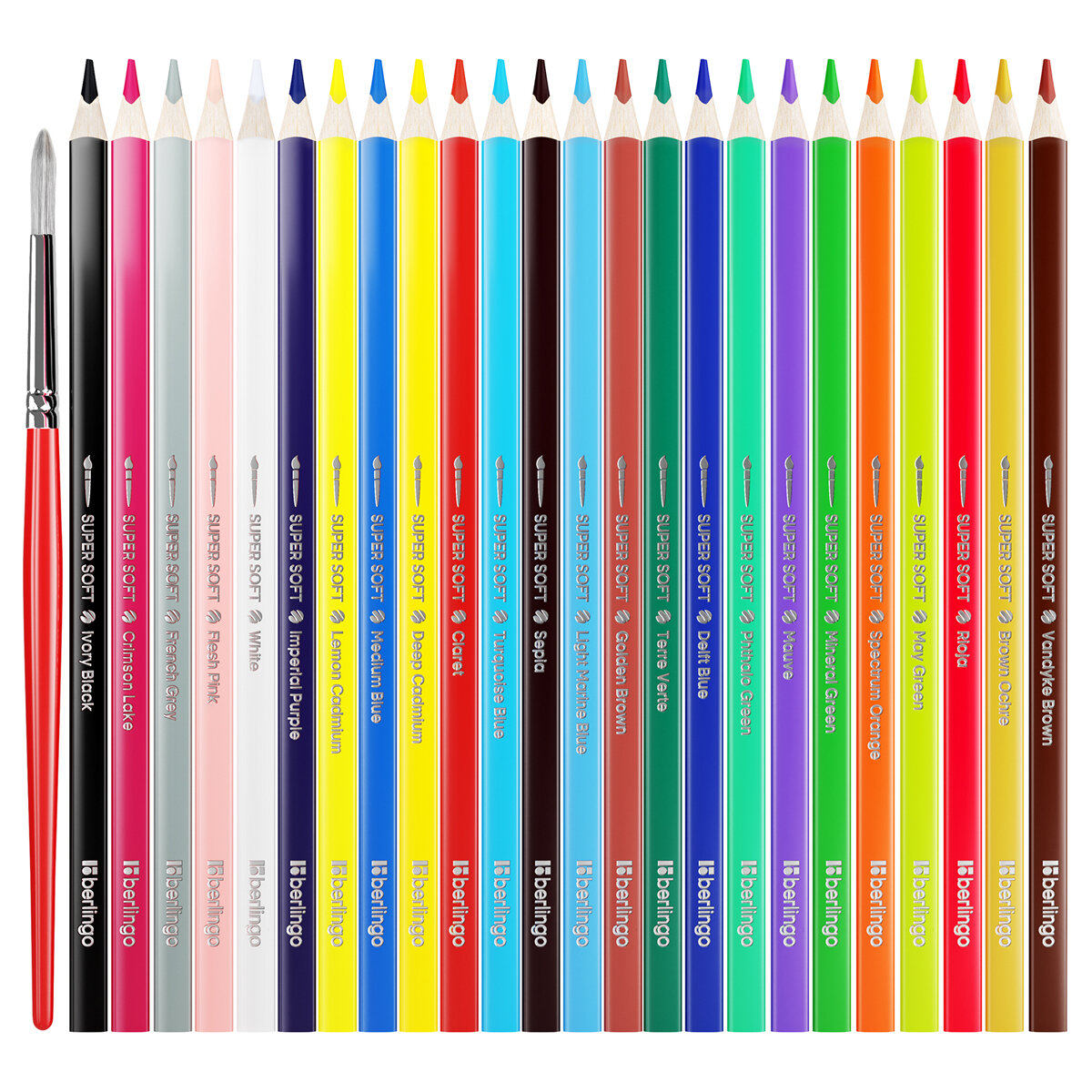 "SuperSoft" - линейка качественно новых цветных карандашей Berlingo. Акварельные карандаши Berlingo обладают идеальной растворимостью, отличной смешиваемостью, мягким письмом и яркими красками. 24 цвета. Кисть в комплекте. Эргономичная трехгранная форма. Указание цвета на каждом карандаше на английском языке. Поле для подписи имени владельца на каждом карандаше. Упаковка в плотную матовую картонную коробку со склеенным европодвесом. Пластиковый трей внутри предотвращает скатывание карандашей и позволяет легко собирать их в коробку.