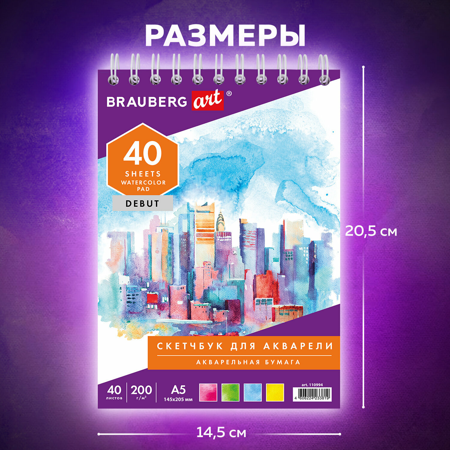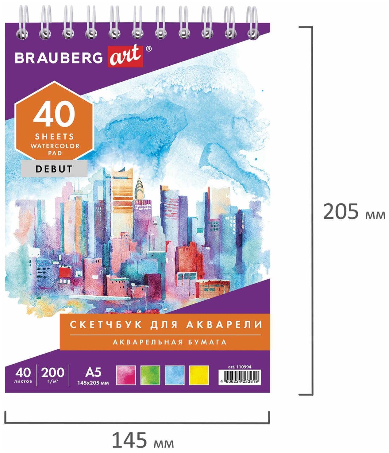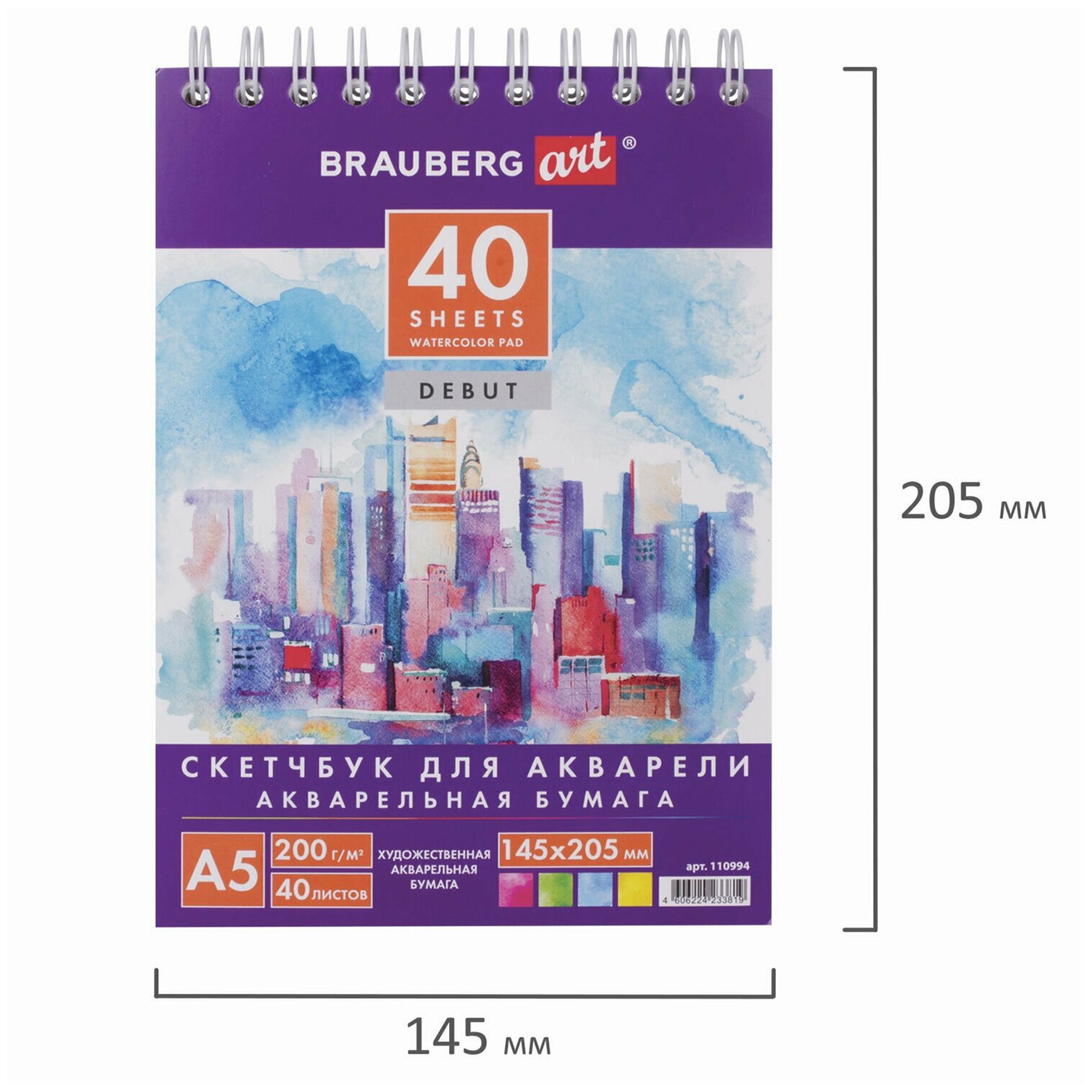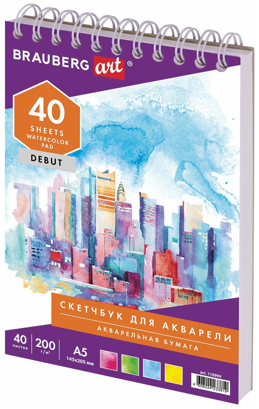 Скетчбук А5 40 листов акварельная бумага 200г/м (110994) Brauberg