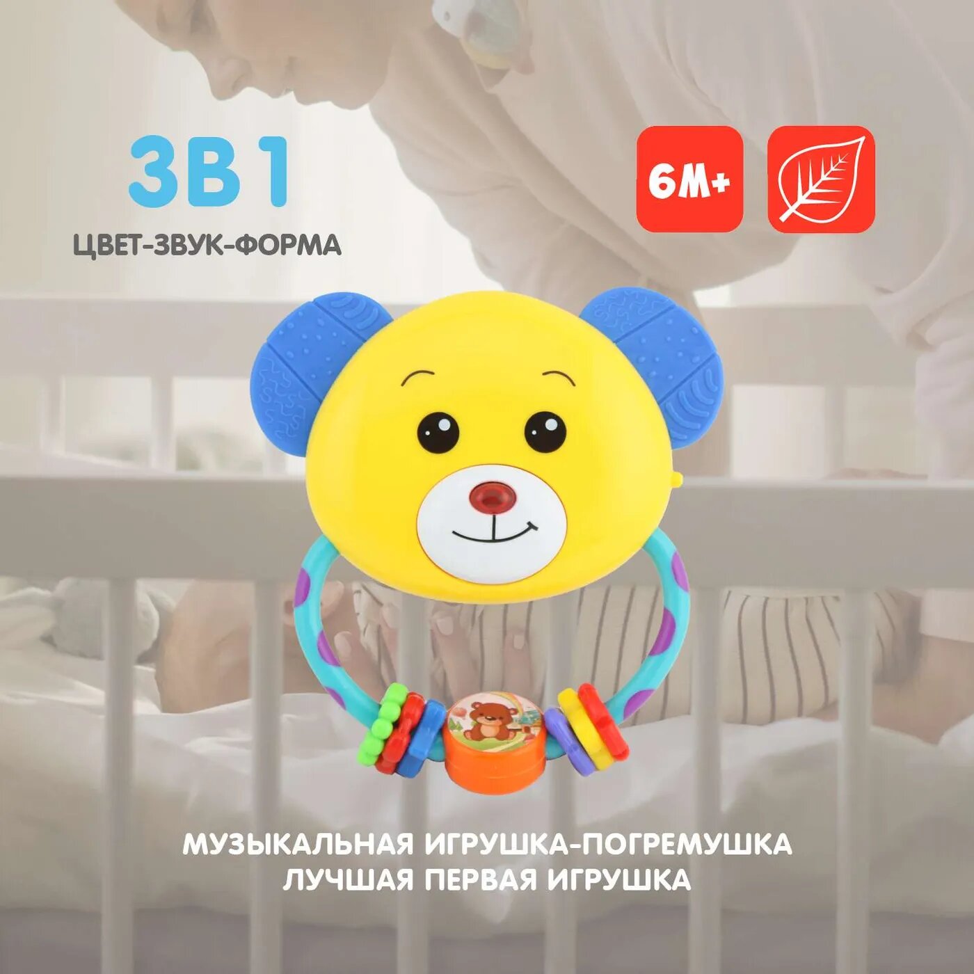 Игрушка-погремушка музыкальная предназначена для малышей от 6 месяцев. При нажатии на мордочку звучат мелодии и мигает нос. Ушки медвежонка являются безопасными прорезывателями. Прикрепленные колечки предназначены для развития мелкой моторики крохи. Игрушка поспособствует формированию тактильных ощущений, восприятия звуков, цветов и форм, поможет в развитии мелкой моторики и воображения Вашего малыша. Работает от батареек в комплекте.