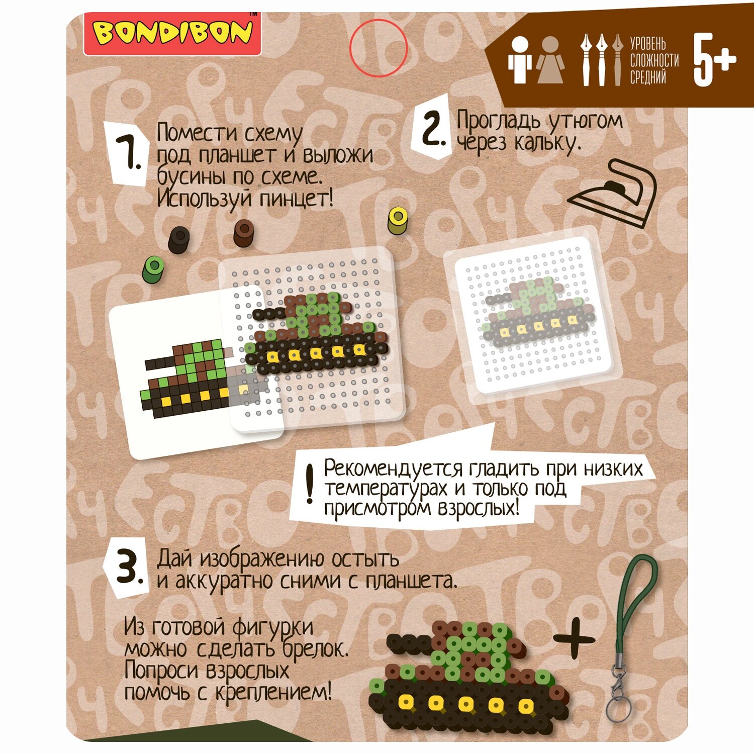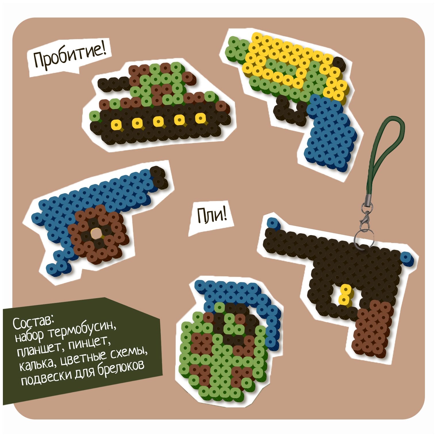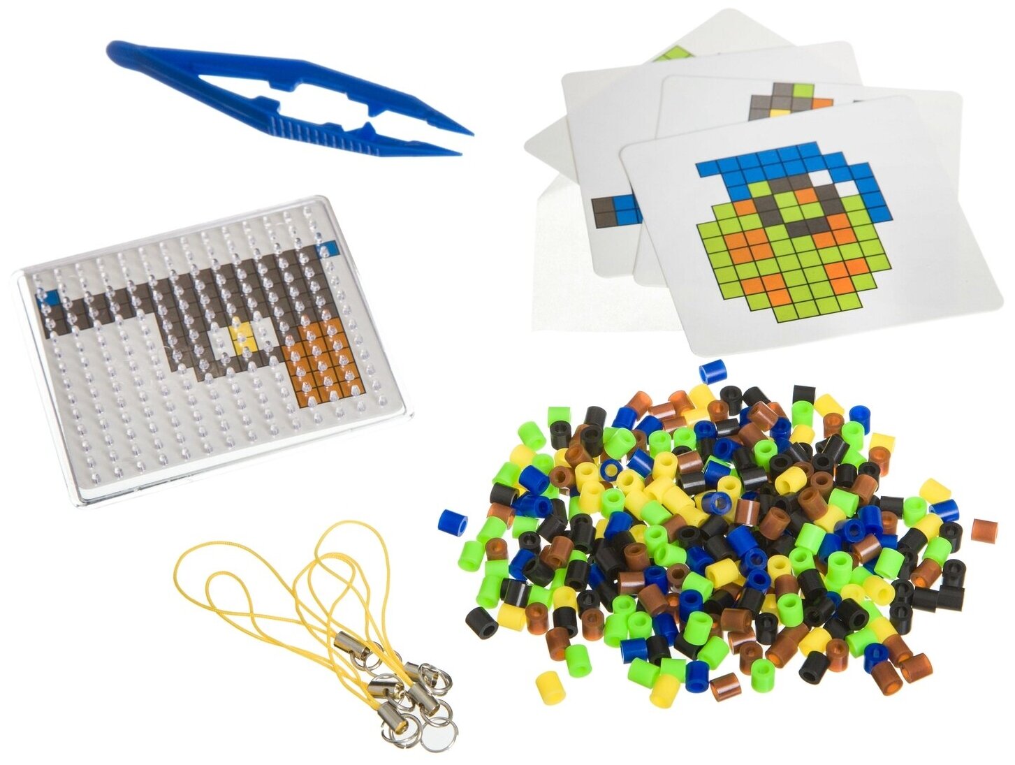 Комплектность: набор термобусин, планшет, пинцет, калька, цветные схемы, подвески для брелоков.