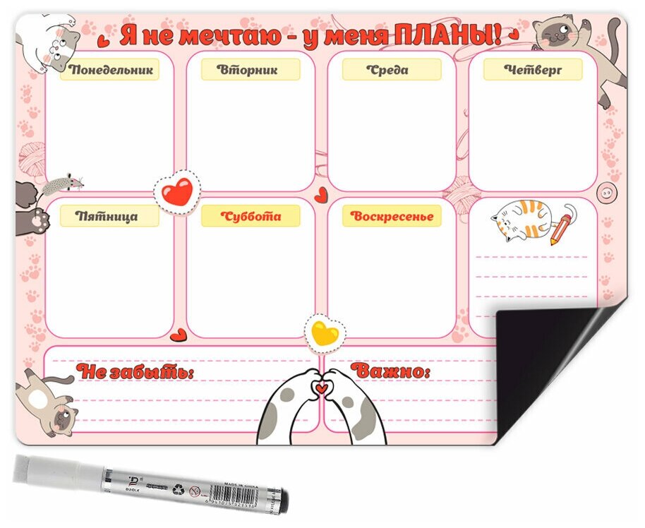 Плоский магнитный планер поможет визуализировать ваши планы на календарный месяц по дням. Его удобно поместить на холодильник или магнитную доску. Записи и пометки следует вносить маркером. Когда ваши планы всегда перед глазами, воплотить их в жизнь значительно легче!Размер: 400х305 мм.