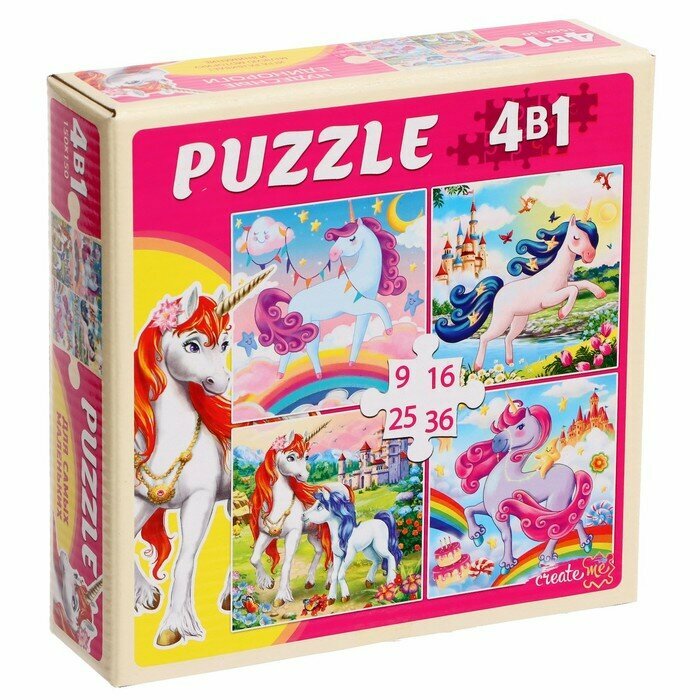 В комплекте 4 пазла: 9, 16, 25, 36 элементов.