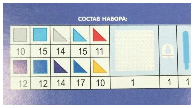 В комплект входит: деталь мозаики (128 шт.), основа (110х118 мм), крючок (1 шт.), палочка (1 шт.), инструкция.