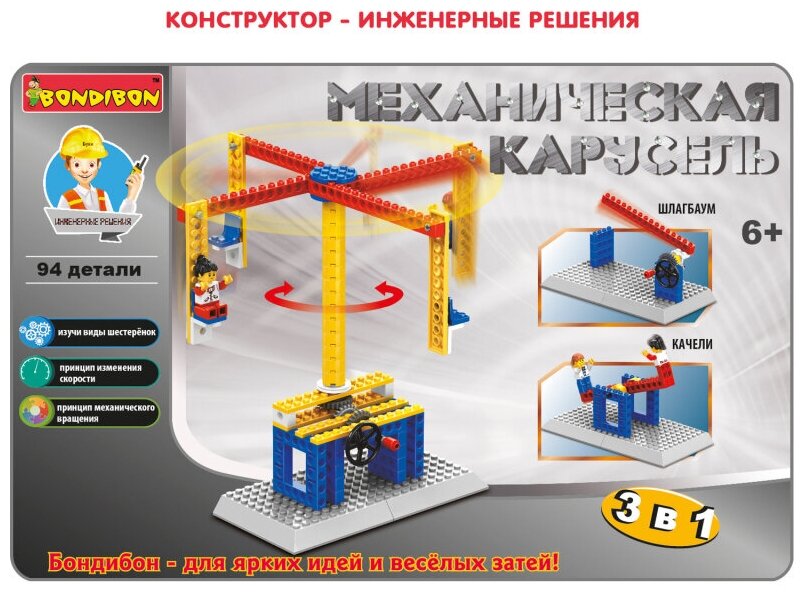 Игра с этим набором от Bondibon поможет изучить виды шестеренок, принцип изменения скорости, принцип механического вращения. Кроме карусели, можно построить шлагбаум и качели.