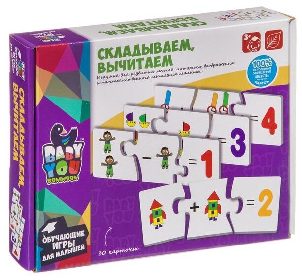 Набор карточек-пазлов от Bondibon предназначен для детей от 3-х лет и поможет в изучении основ сложения и вычитания. Состоит из трех половинок, две из которых показывают количество предметов для сложения или вычитания, третья цифру-результат решения примера. Ребенку необходимо собрать все части, правильно подобрав соответствующие карточки. Способствует в развитии логического мышления, внимания, речи, памяти, воображения и мелкой моторики.