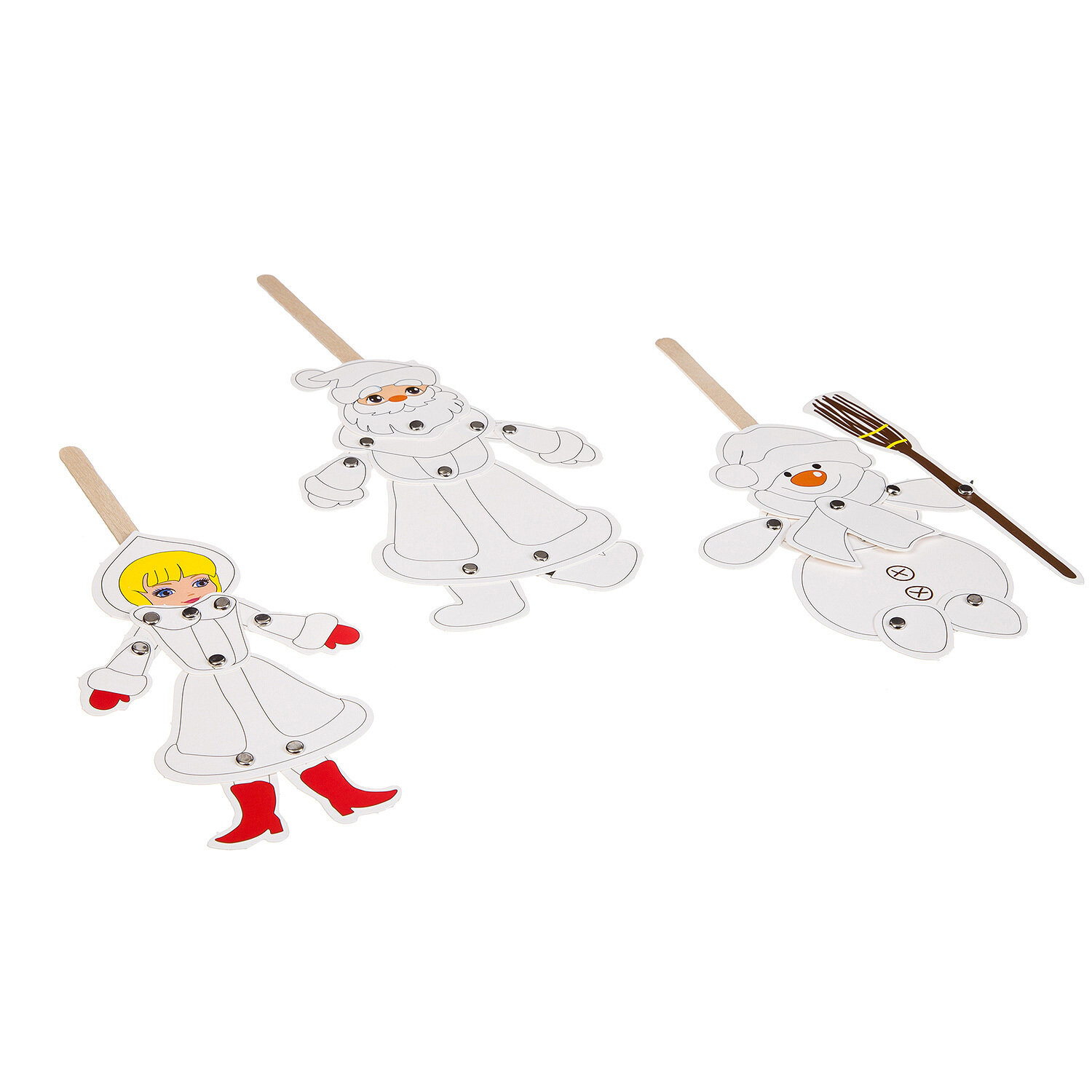 Новогодний оригинальный набор для детского творчества и увлекательная игра одновременно! Из разнообразных ярких деталей ваш ребенок с огромным удовольствием составит Дед Мороза, Снегурочку и Снеговика, скрепляя их между собой металлическими безопасными пинами - кнопками. Большинство частей - подвижные, что делает игру еще более динамичной и занимательной.