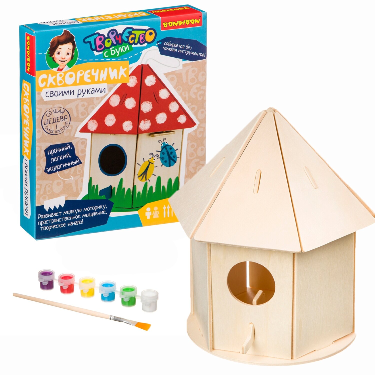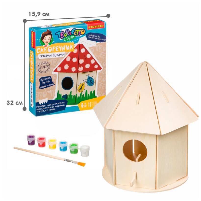 Для этого Bondibon подготовил специальный набор, в котором есть все необходимое: детали из фанеры, кисть, краски, схема сборки. Скворечник легко собирается без помощи инструментов!