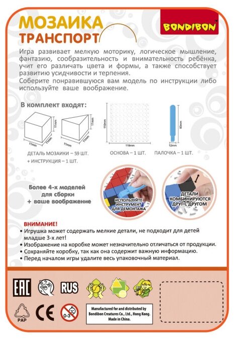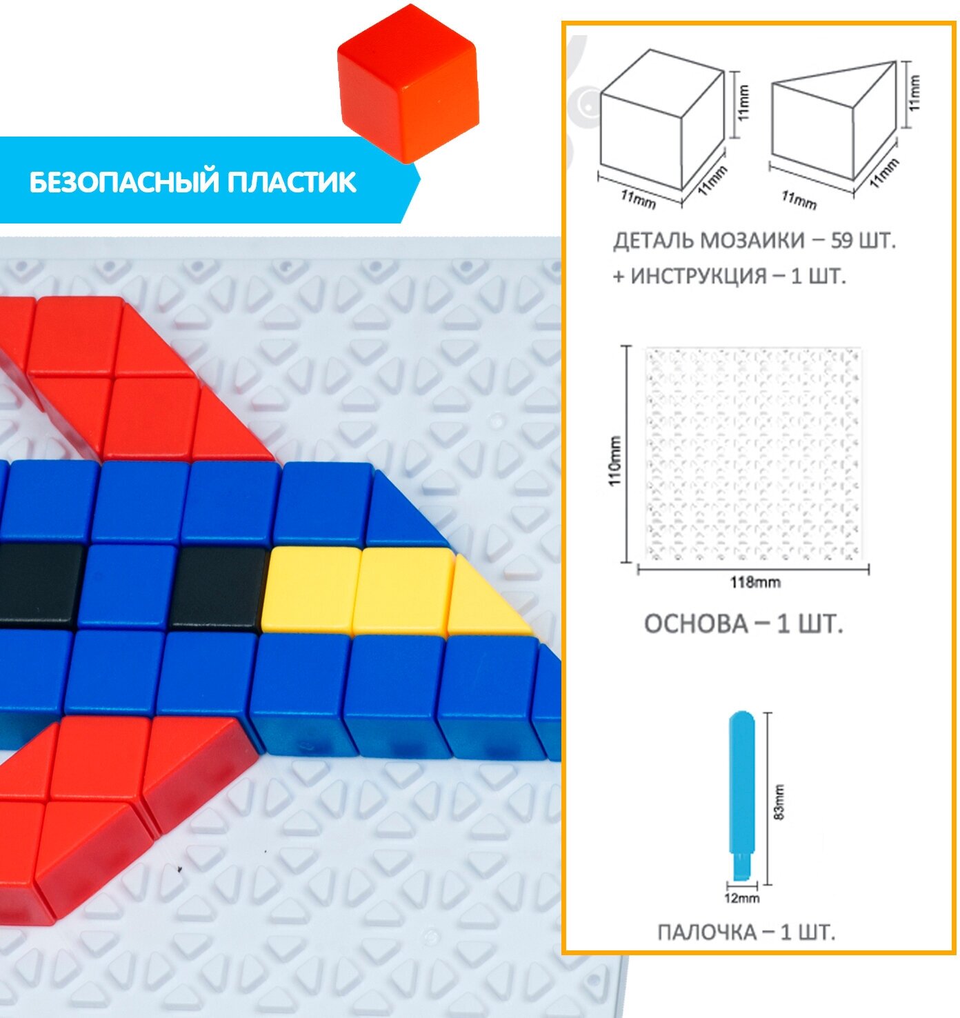 В комплект входят: деталь мозаики - 59 шт., основа – 1 шт., крючок – 1 шт., палочка – 1 шт., инструкция.