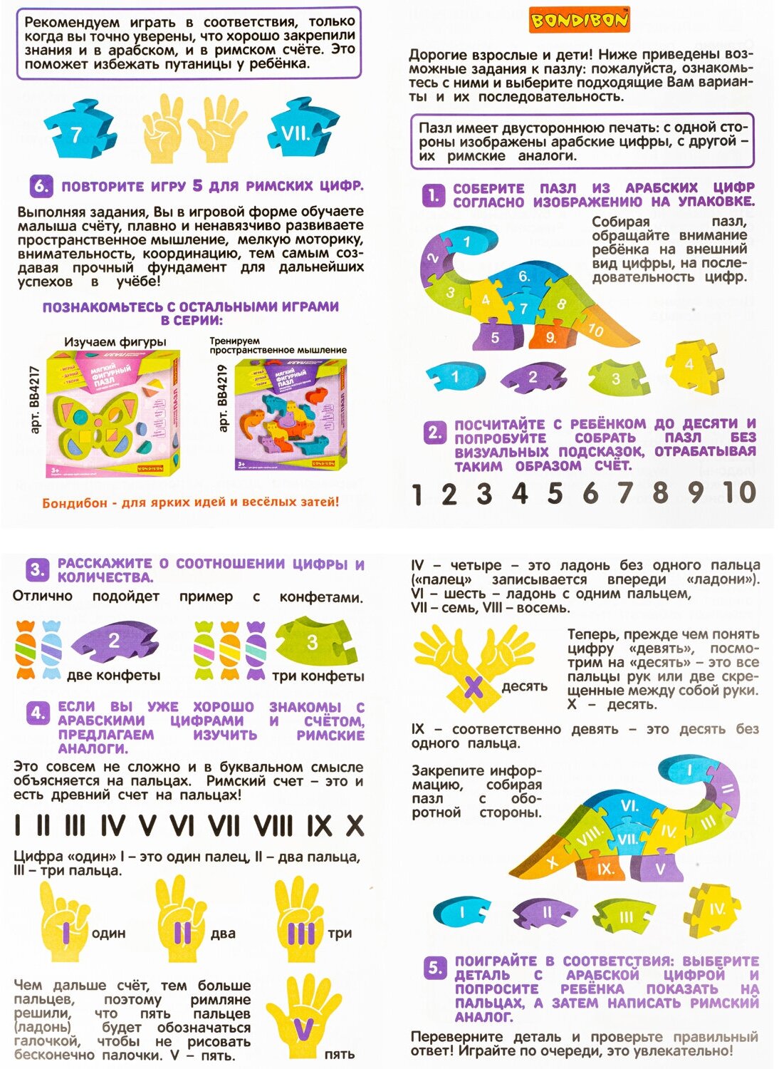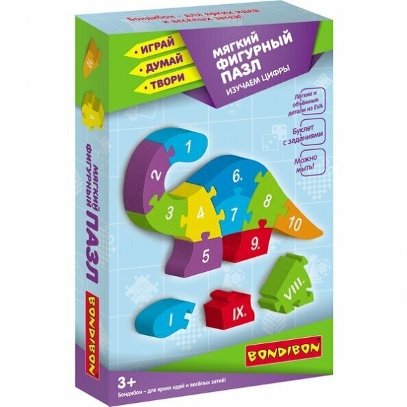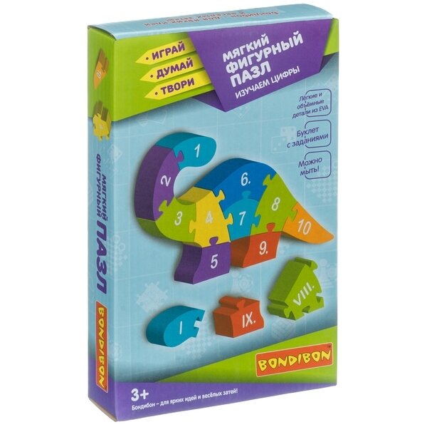 Мягкий фигурный пазл динозаврик серии Играй Думай Твори от Bondibon непременно понравится маленьким мальчикам и девочкам! Изучайте цифры и счет, складывая фигурку из легких красочных деталей, которые удобно держать в детской ручке! Пазл имеет двустороннюю печать (арабские, римские цифры). Постепенно переходите от простых к сложным заданиям. Соберите динозавра из арабских цифр согласно изображению на упаковке. Посчитайте с ребенком до десяти. Познакомьте малыша с римскими цифрами. Закрепите информацию, собирая пазл с оборотной стороны. А еще с готовой фигуркой можно придумать множество сюжетно-ролевых игр! Динозаврик, разработанный профессионалами, поможет выучить цифры, счет от 1 до 10, разовьет цветовосприятие, пространственное мышление, логику, внимание, координацию, мелкую моторику и эмоциональный интеллект. Прочные и долговечные детали можно мыть. О качестве и безопасности позаботился Бондибон. В набор входят: элементы пазла из EVA, буклет. Возраст 3+