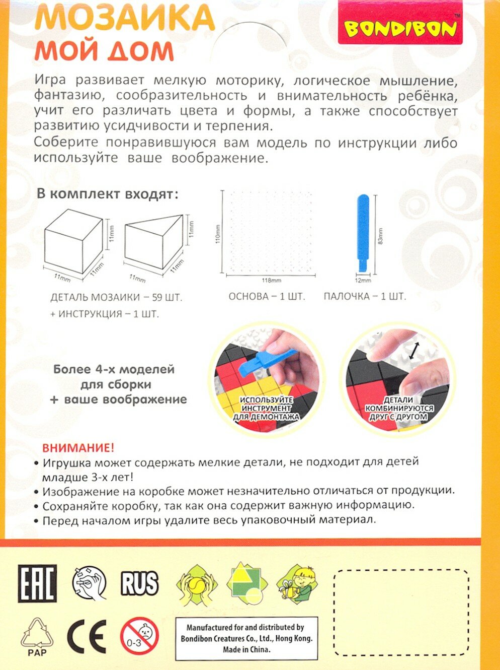 Игра развивает мелкую моторику, логическое мышление, фантазию, сообразительность и внимательность ребенка, учит его различать цвета и формы, а также способствует развитию усидчивости и терпения.