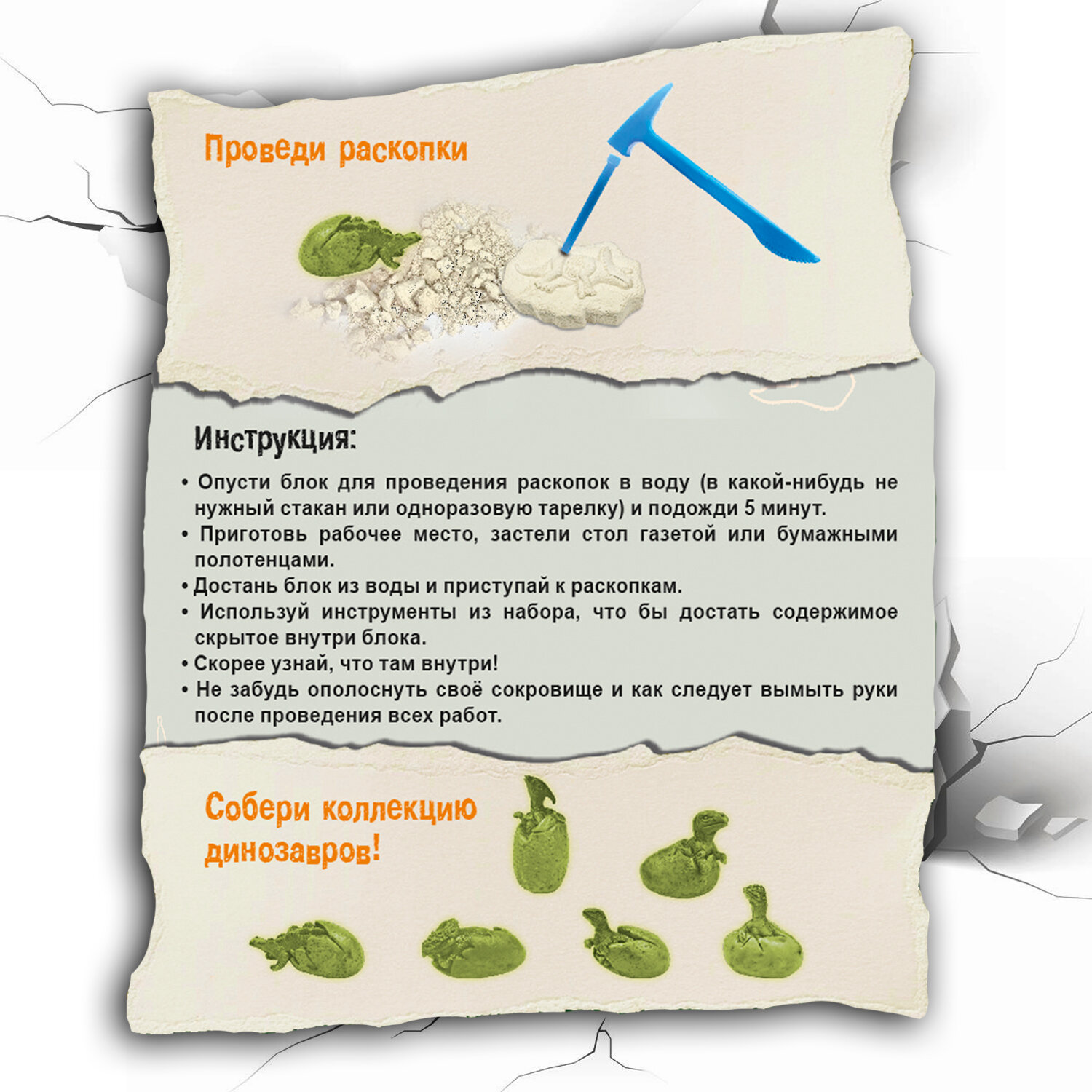 Прикоснитесь к древнему миру вместе с Историческими раскопками Науки с Буки! Проведите настоящие исторические раскопки и посмотрите, что находится внутри блока для раскопок! Соберите коллекцию динозавров.