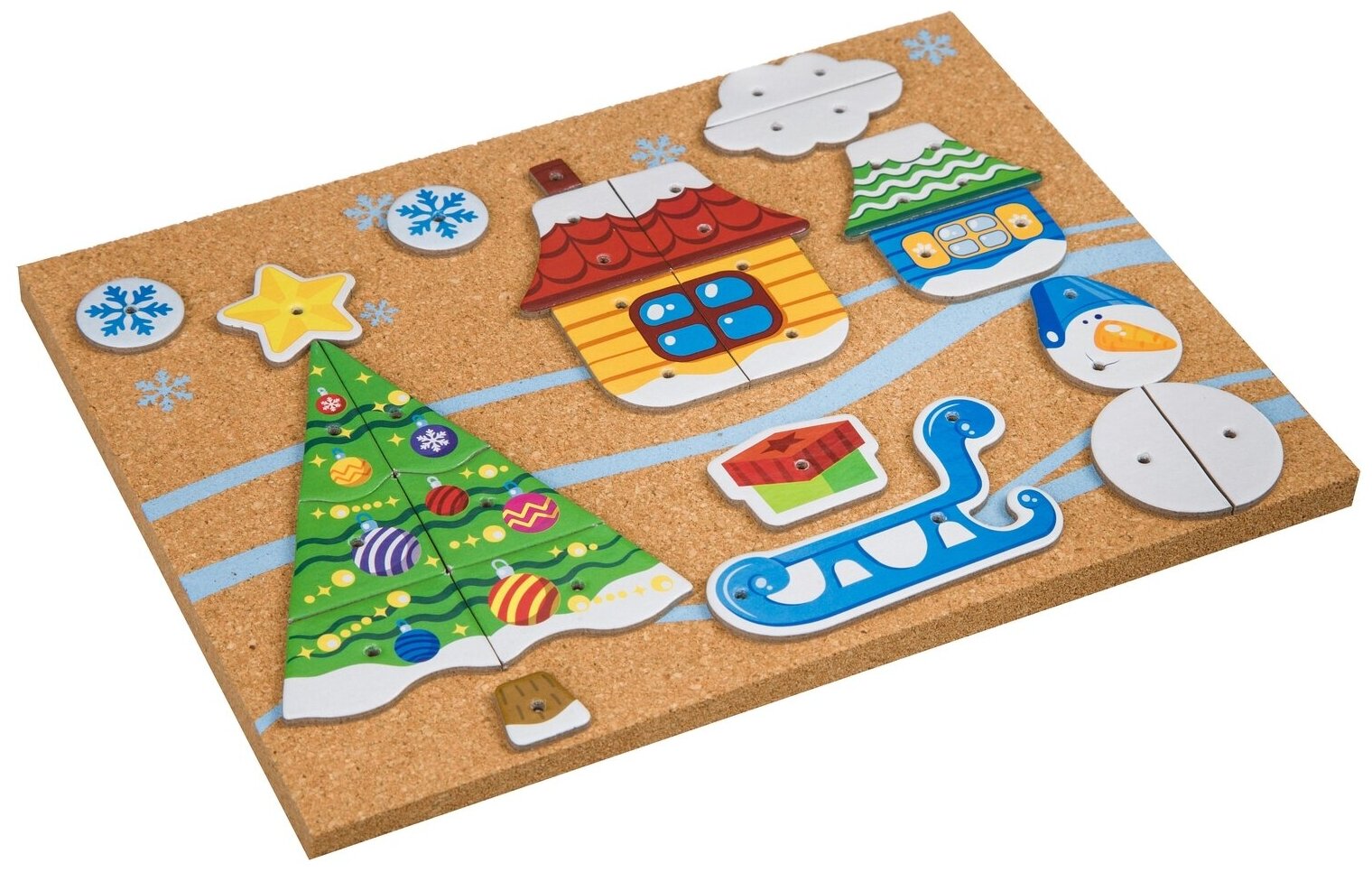 Увлекательная игра предполагает создание новогодней картины из деталей, прикрепляемых к основе с помощью гвоздиков.