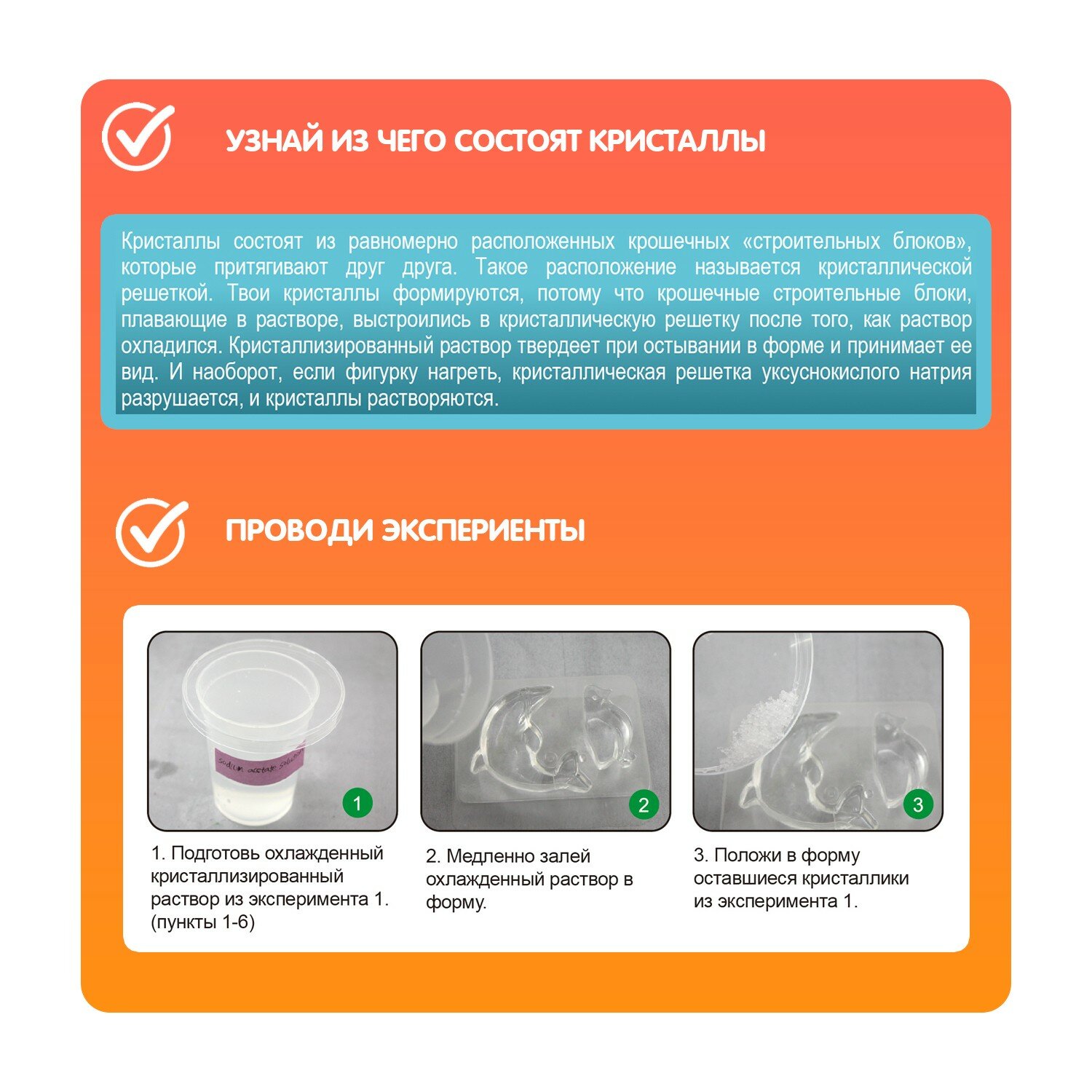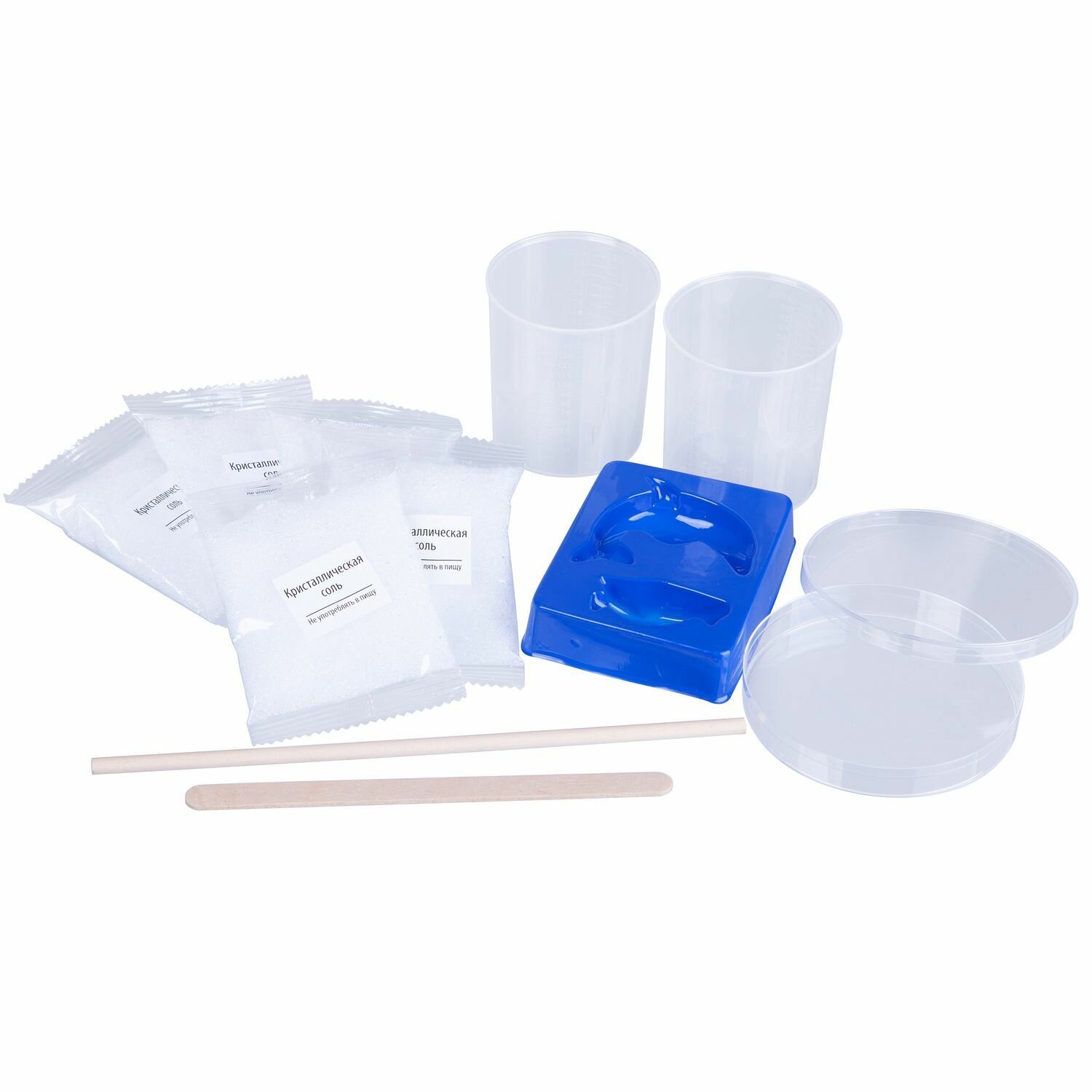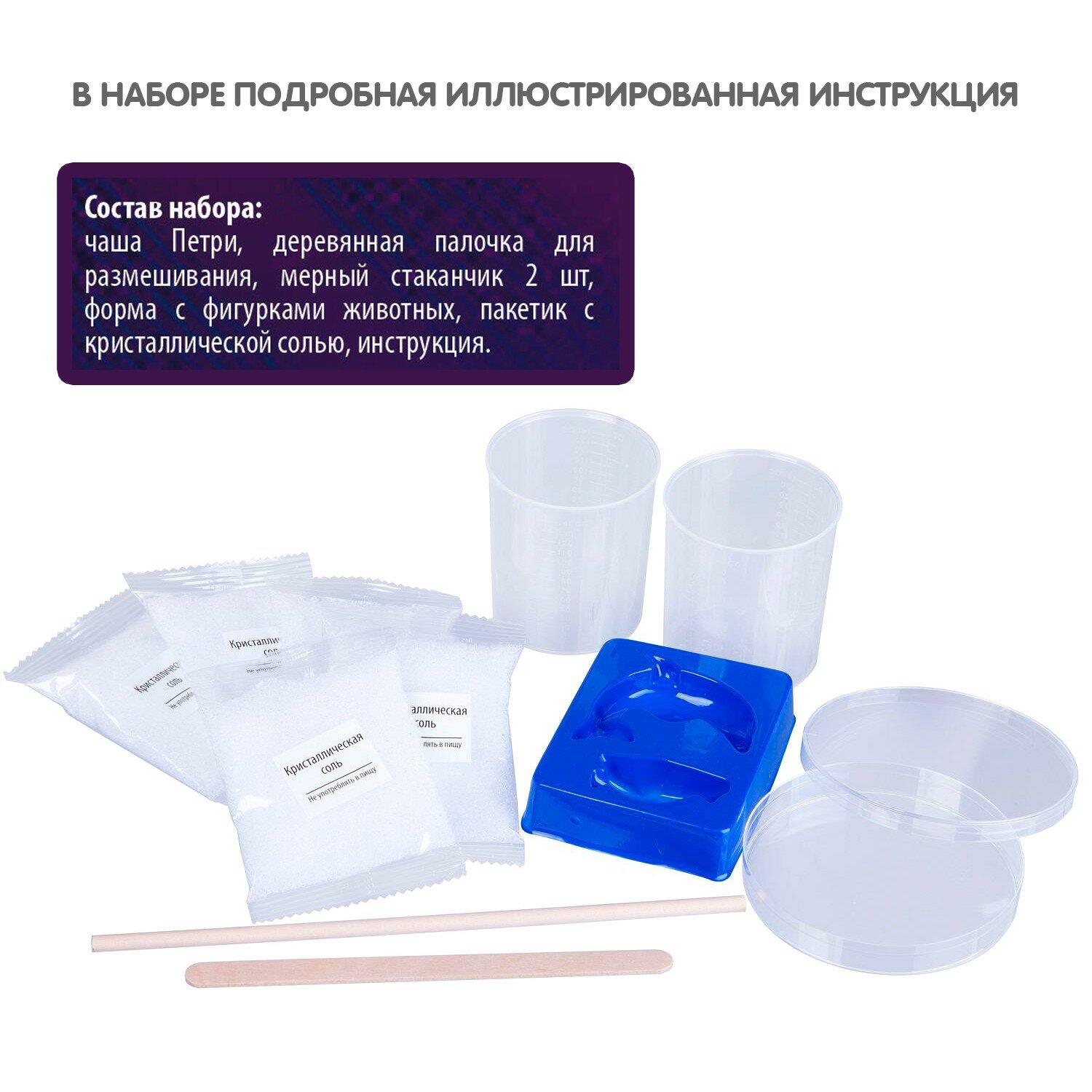 Состав набора: чаша Петри, деревянные палочки - 2 шт., мерный стаканчик - 2 шт., формы с фигурками животных, пакетик с кристаллической солью, инструкция.