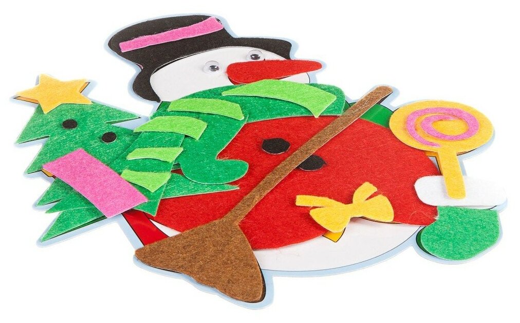 Набор для творчества - создание оригинального подарка своими руками. С помощью картонной основы с напечатанными рисунками и самоклеящихся деталей из фетра вы сможете смастерить красивый коллаж Снеговик. Использовав подставку из набора, украсить им свой интерьер!