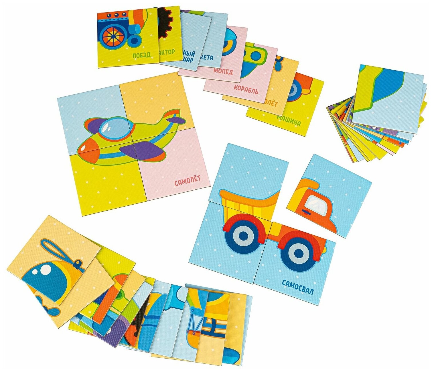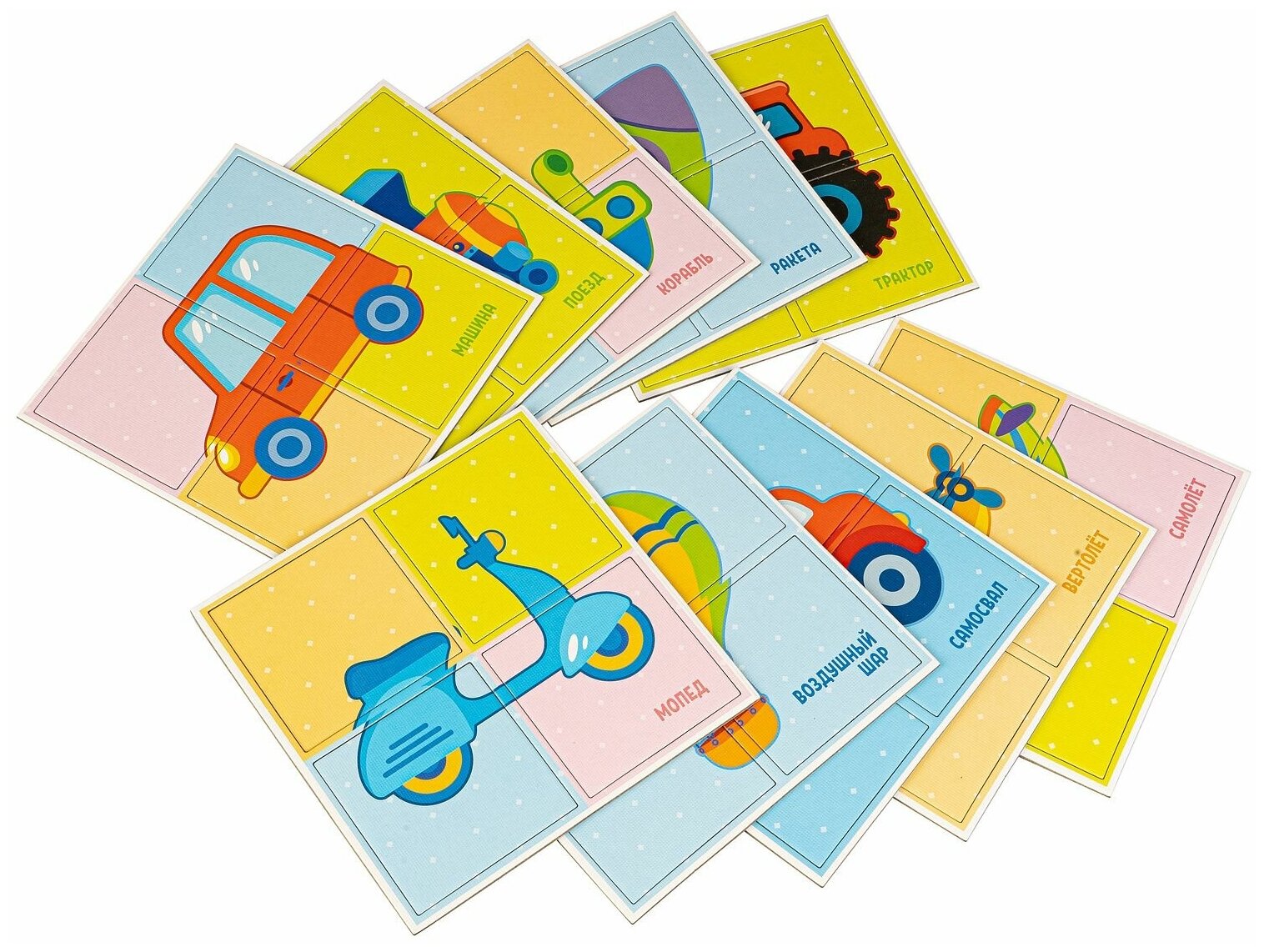 В комплект игры входят 40 карточек-пазлов (10 картинок).