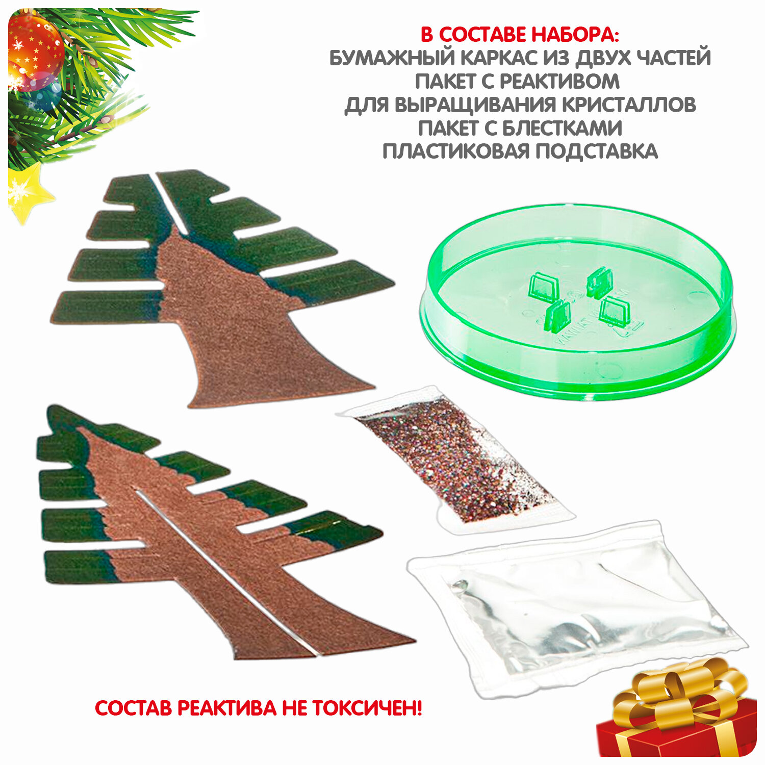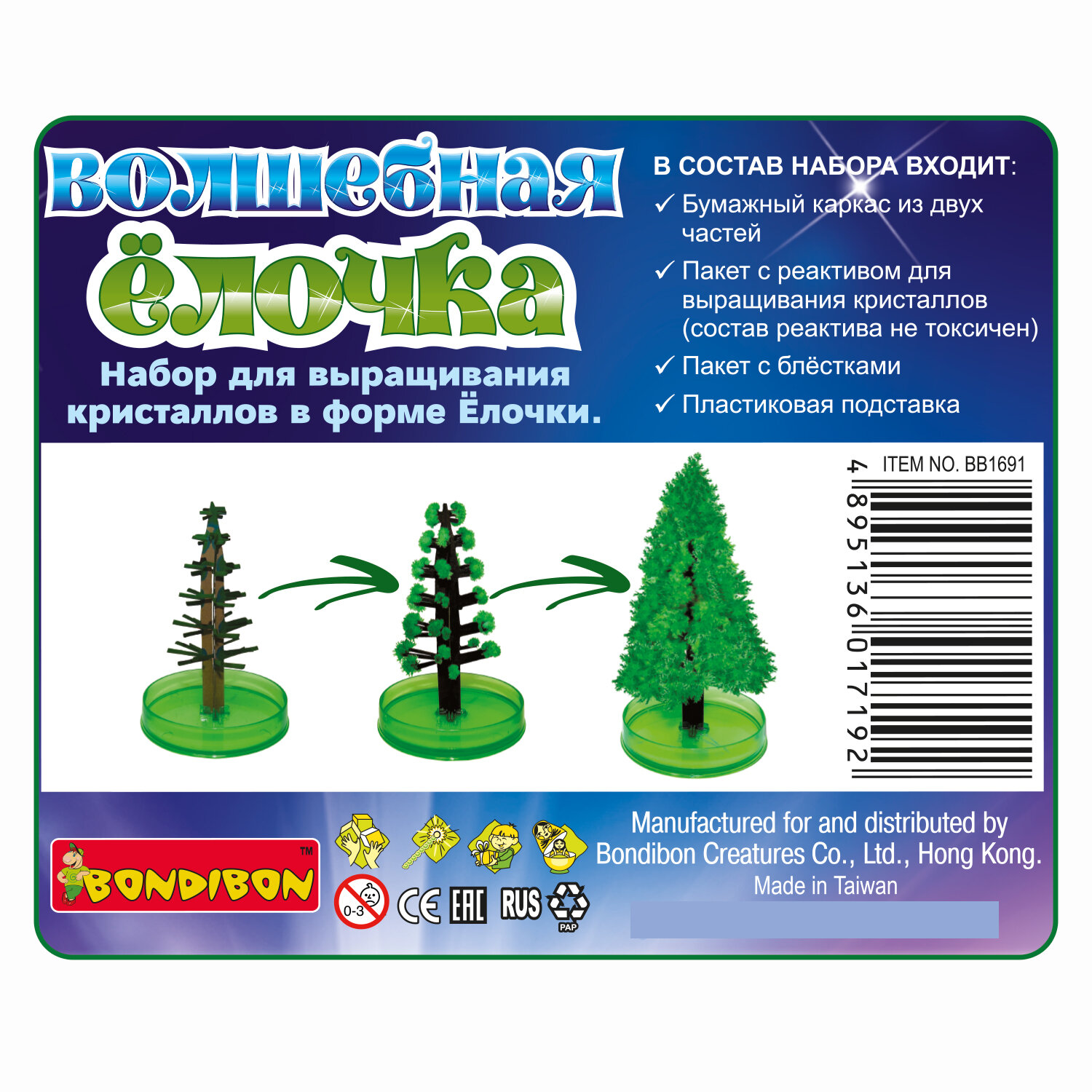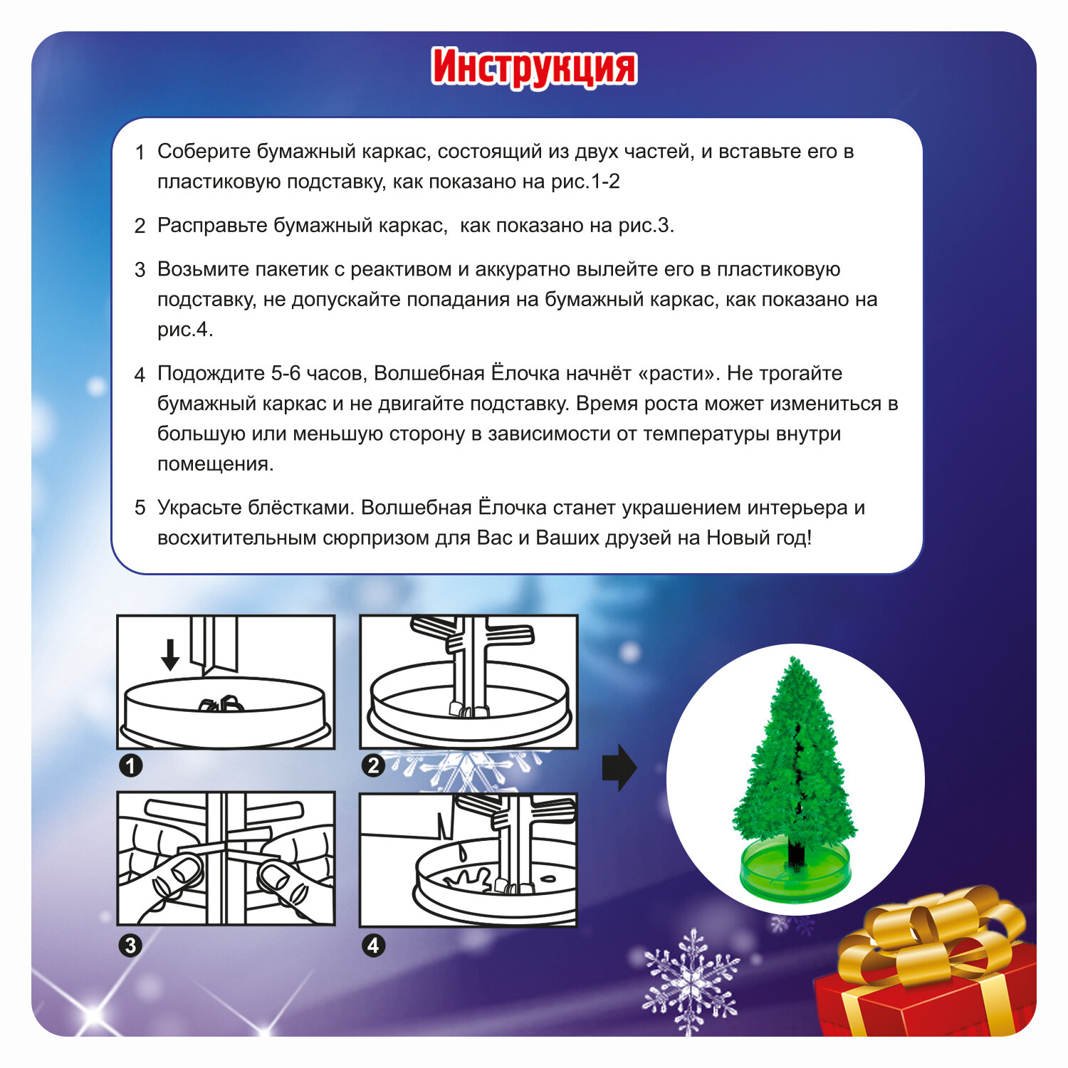 интересный набор для творчества. ребенок в 4 года был в восторге. кристаллы вырастают на глазах. всё очень просто, собираем ёлочку из картона, вставляем в подставку, жидкость выливаем в подставку. если это сделать в первую половину дня, то к вечеру на ёлке вырастут иголки. Ёлка получается очень красивой, кристаллы как настоящие иголки. Есть и минусы, поделка высотой всего 10 см. и при попытки прикоснутся к ней или хотя бы передвинуть, вся эта красота осыпается. На 5 день, Ёлка почти лысая, ребенка так к ней и тянет.